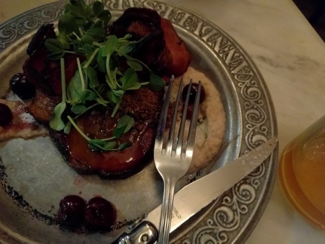 We started with the Ploughman’s Platter, which was amazing. Black pepper bread, pub cheese, a sharp cheddar, venison salami, pickled celery, actual pickles, and some sort of smoky tasting jam. I didn’t care for the jam, it was like eating a bonfire, and I don’t eat meat, but the rest was so good. I could have eaten that pub cheese all night. The pickled celery was also amazeballs.