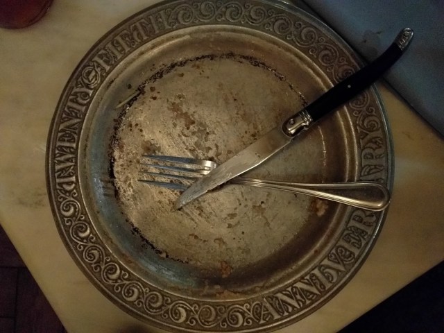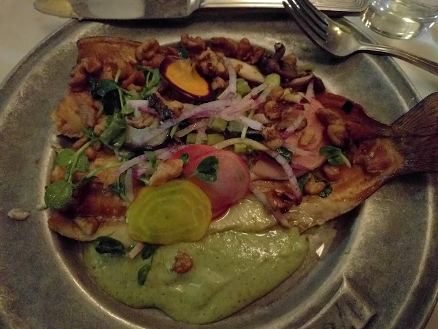 I had the whole smoked trout, with aioli, nuts, and veggies. I knew to expect a head, since it said “whole” right in the description but I still couldn’t look at it. My husband and our awesome waitress discreetly took care of it for me. I thought the trout was very good, especially with the sauce. No complaints, but I also wouldn’t go wild over it.