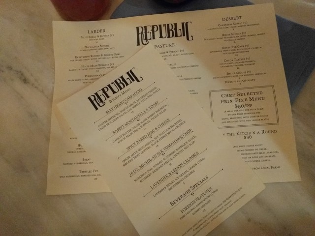 This building is way cool, which is not depicted in this photo. Lol. The restaurant is in the Grand Army of the Republic Building in Detroit, and it looks castle-like. Republic is a scratch kitchen, meaning they make everything from scratch. They also locally source as much as they can, which is pretty darn awesome. Since it is locally sourced, it is also seasonal.