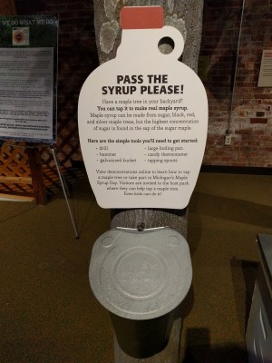 The second floor gave kids the opportunity to stand in a giant duck blind, a prop airplane, and learn about different natural resources, including maple syrup! There was also a nice display about Citizen Science, which I thought was really cool. When we were walking around there was a small school group visiting, so we couldn’t get too close to some of the exhibits, but they seemed to center on hunting, which I was fine with skipping. So was Wyatt, who was just a little freaked out by the taxidermied animals ~ including Smokey.