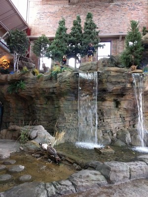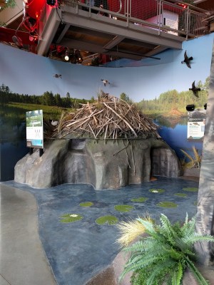 As you walk through the OAC, you are introduced to all the different natural resources and landscapes that make up the state of Michigan – water, sand, forest, flora, fauna. I didn’t take photos of everything, but you get to “explore” the watery world of the Great Lakes and Michigan’s rivers, complete with a simulated kayaking ride and simulated fishing, stand in a giant yurt and learn about the many camping opportunities that abound here, stand behind a giant waterfall, explore a mine (Detroit has huge salt mines), learn about the sand dunes, and duck into a beaver dam exhibit. The waterfall was a big hit with Wyatt, as was the aquarium. The waterfall was my favorite part too.