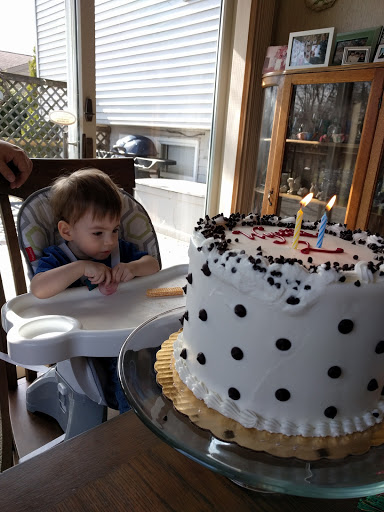 I love this photo, since the angle makes it look like the cake is ten times bigger than the boy. It was a huge cake, but not bigger than a toddler. Lol. It was seriously delicious. We ordered it from a nearby bakery, a real one, named