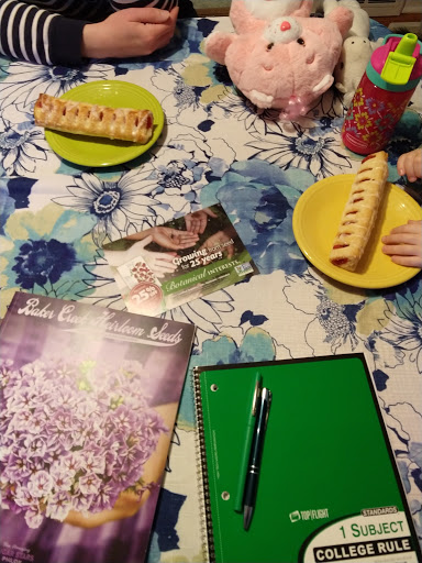 Well, a rough plan at least. My sister-in-law Chrissy and I got together Monday morning with coffee, and strudel and seed catalogs with our little helper, my niece . And her Care Bear. And we got to talking and planning and the room just seemed warmer and more full of life just discussing what we hope to grow. I had Chrissy’s houseplants behind me, adding to to the ambiance.