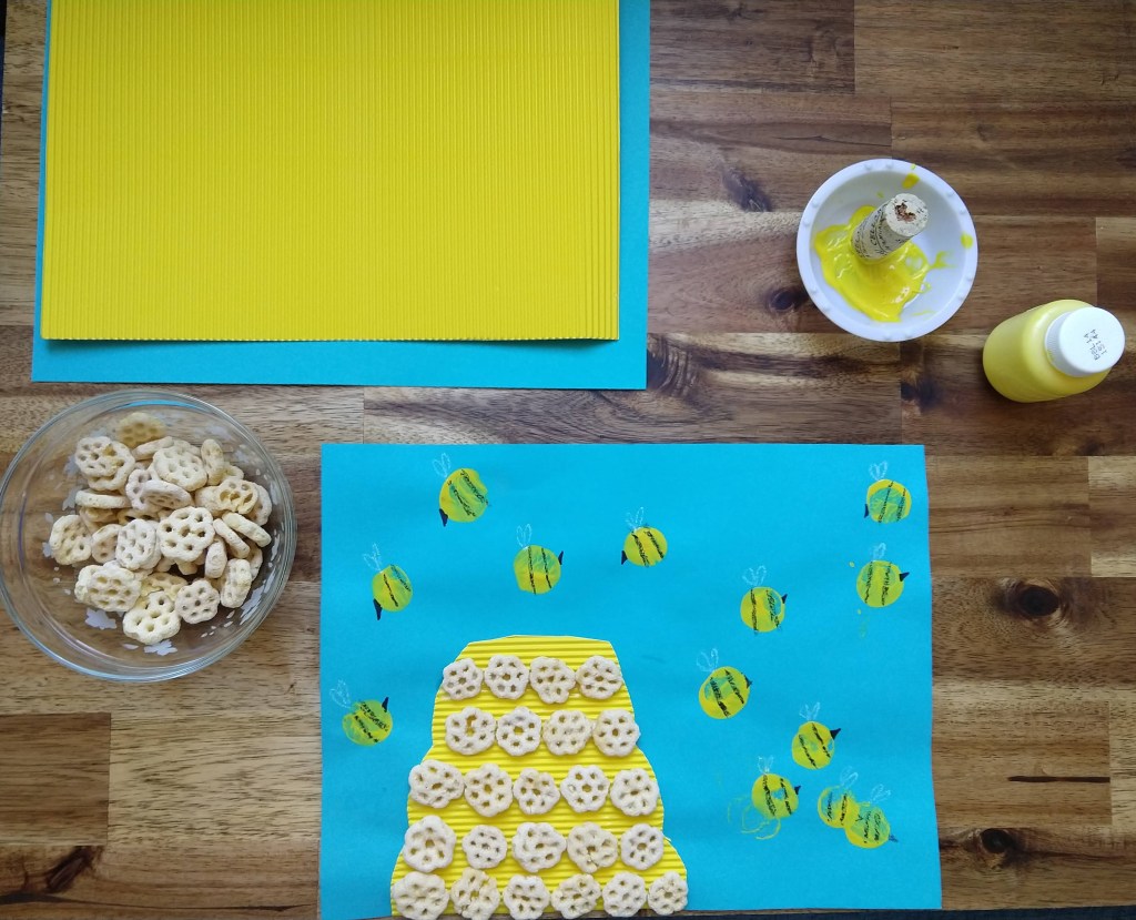On Monday we started with the letter H, for honey and hive, played a memory match vocabulary game, talked about the different types of hives, and “created” a hive out of Honeycomb cereal. Oh and snacked on some honeycomb cereal with drips of honey on it, which was as sticky as it sounds.