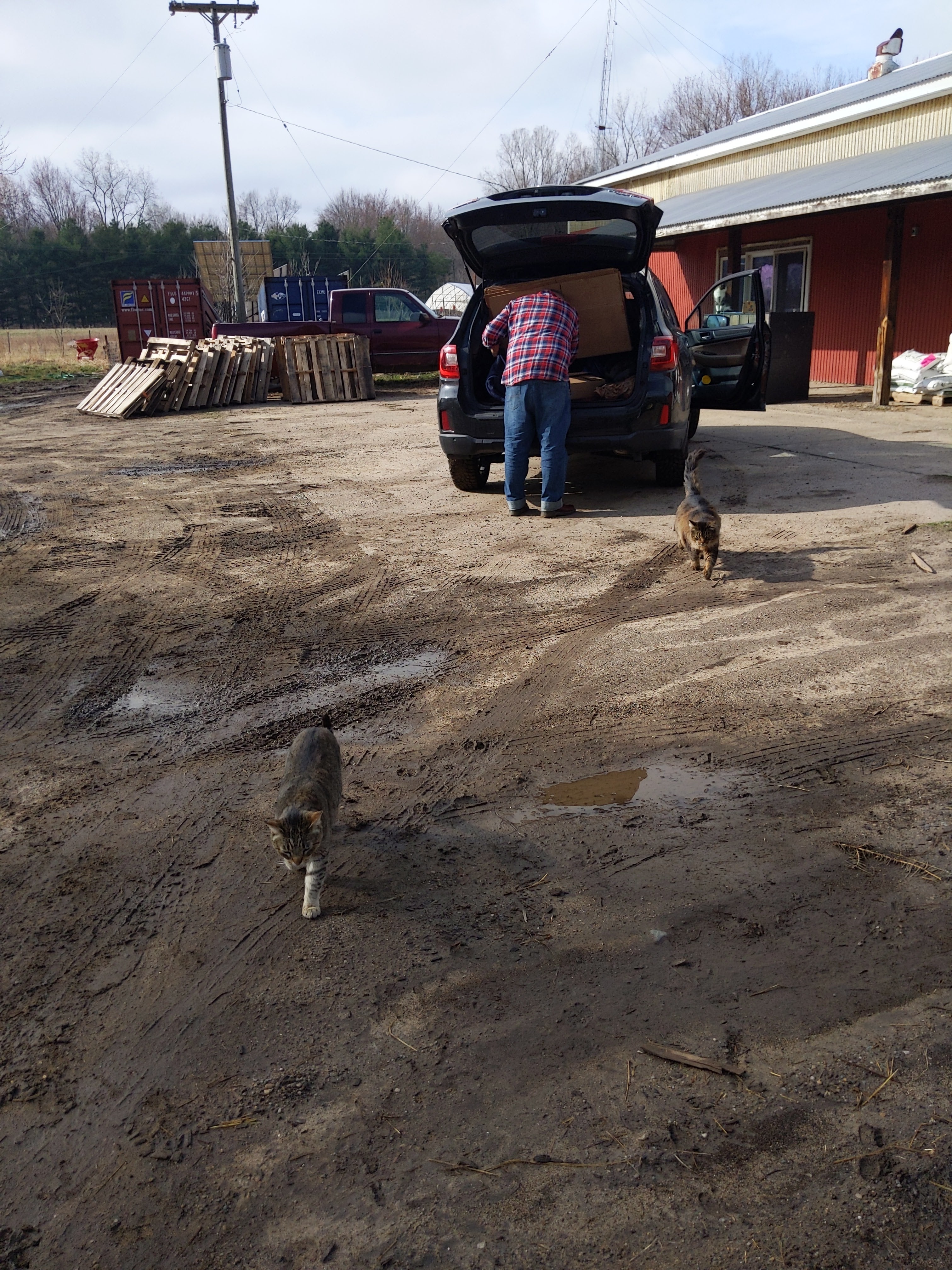 We did make friends with these cuties! Farm dogs and farm cats.. I love how that tabby is guarding the deliveries like she is the postmaster or something.