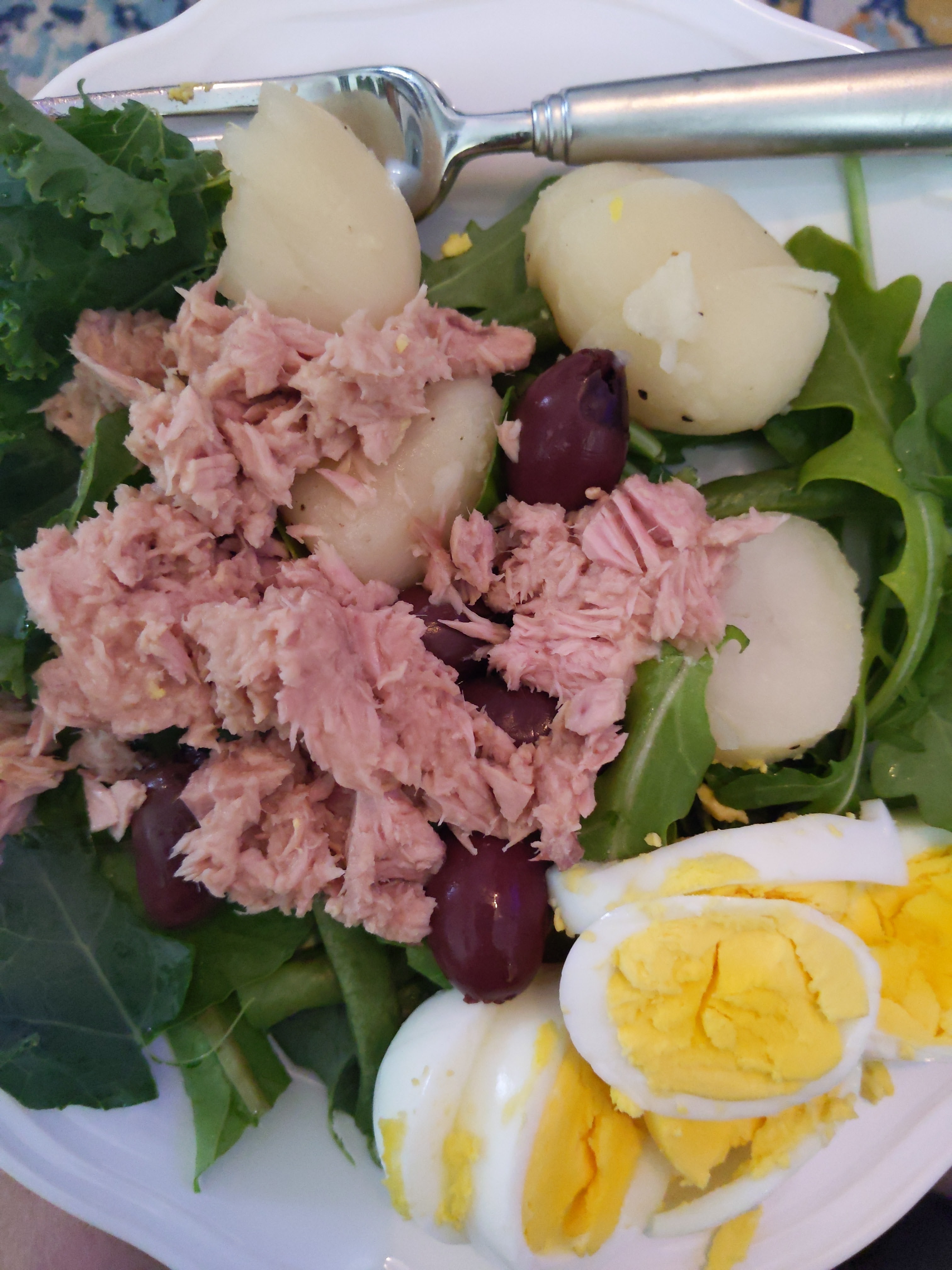 Then we just kind of played about. Billy made some shelves and hung them in the office ( LOVE them!), I took some notecards I had bought from Alex Boon Art (I posted about them before, in my For the Love of Rabbits post) and framed them in an old frame I had, and then we had kitchen pantry nicoise salad for dinner. Hanging the art is the very last thing we need to do to finish the office – besides filling those shelves! I will do an office update when it is all finished.
