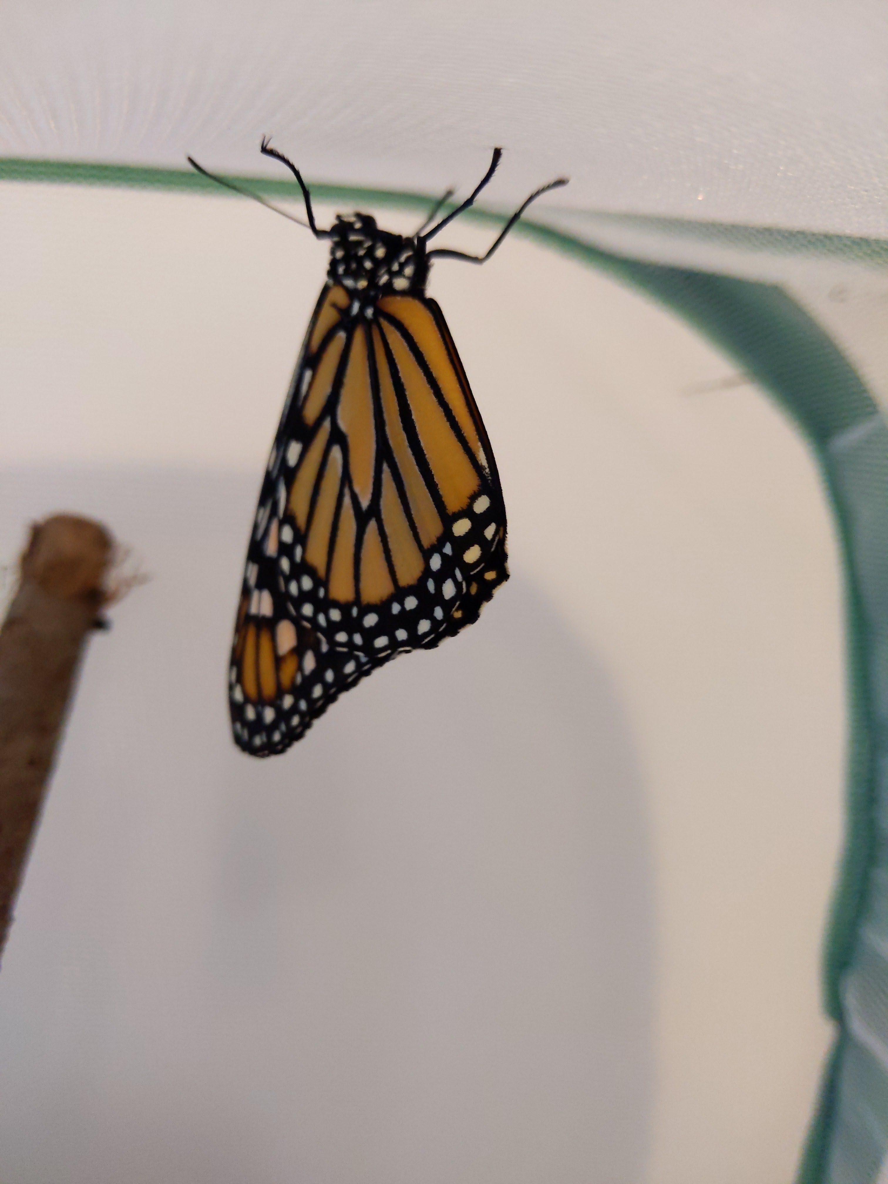 Cordelia was giving me great anxiety. When monarchs emerge, they generally hang from the chrysalis for an hour or more, to allow their wings to dry. For some reason though, Cordelia had itchy feet and wanted to rush the process. She kept walking across the top of the enclosure, hanging down of course, but since she was just new, she kept falling! Her wings were still wet and she couldn’t move once she fell and she would flail her little legs in the air. I freaked out because if she remained like that, in a crumpled heap, her wings would be malformed and she wouldn’t be able to fly. I would reach in, let her climb on my finger, and then help her back to the top. I did this eight times before she just went to sleep for the night. We made it, and she was able to fly free and high today when I released her.