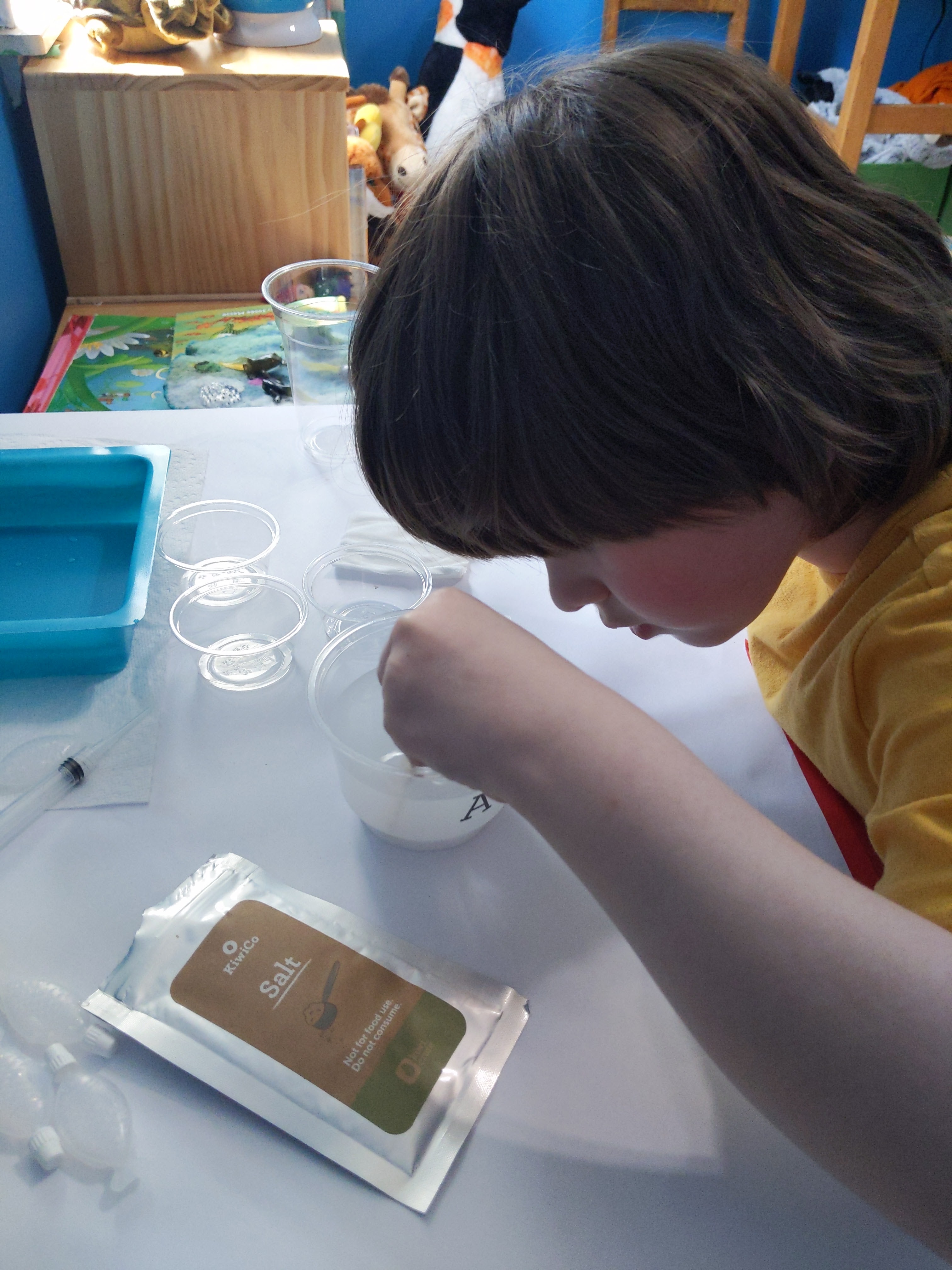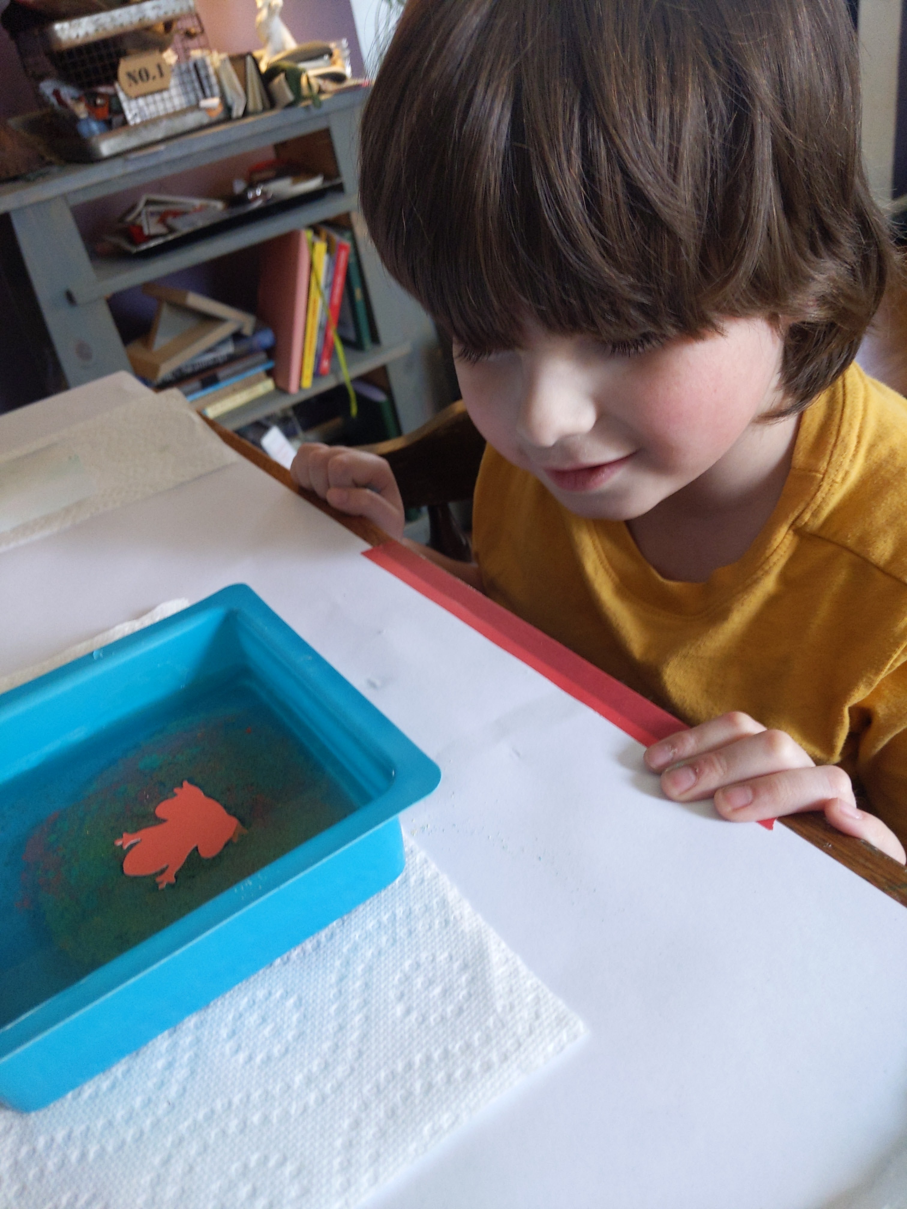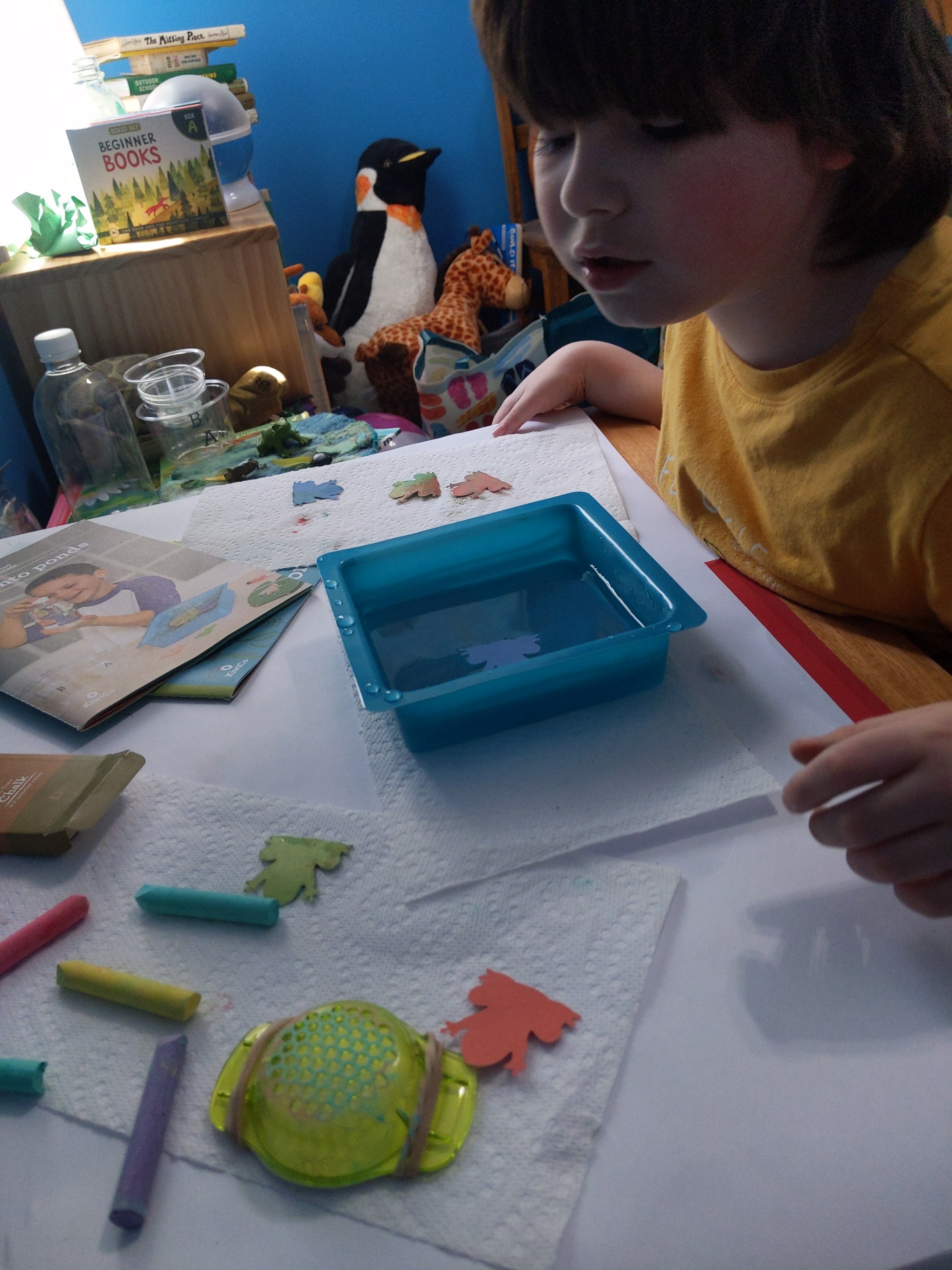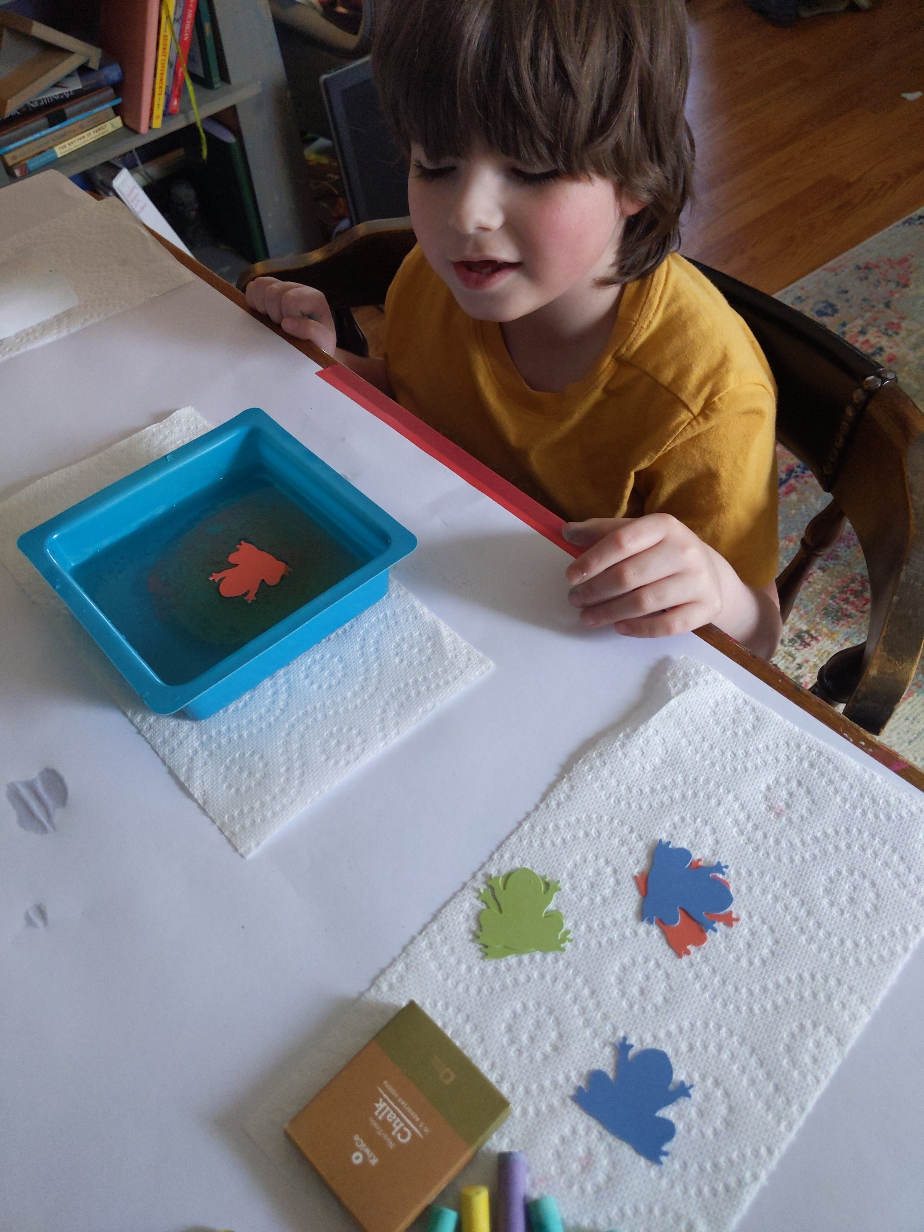 It was a fun mix of arts and crafts combined with science. We started with a chalk and frog activity, where Wyatt grated different colored chalk, and carefully tapped the dust into water. He dropped a paper frog into the chalk, again very carefully, and then we waited for the chalk to stick. The science behind this is that water likes to stick itself more than to air, so this means that at the surface the water forms a tighter layer as it hugs itself, which creates strong layer to hold up the chalk dust. However, if you bump it, the layer breaks and the chalk sinks. The artsy part comes in with the frog – if you haven’t caused the chalk to sink, it will stick to the paper frog. We were successful a few times, although, not every time. Lol.