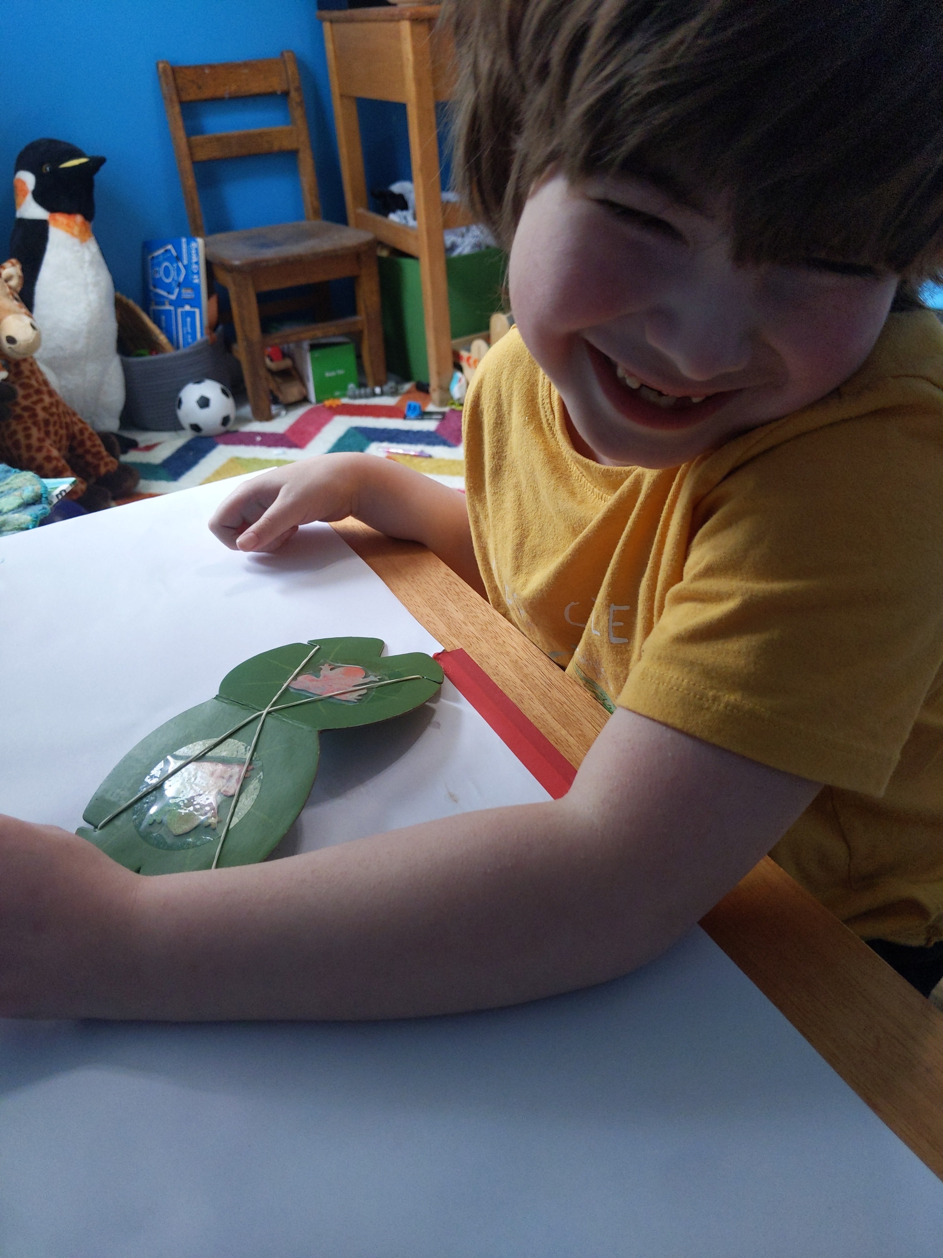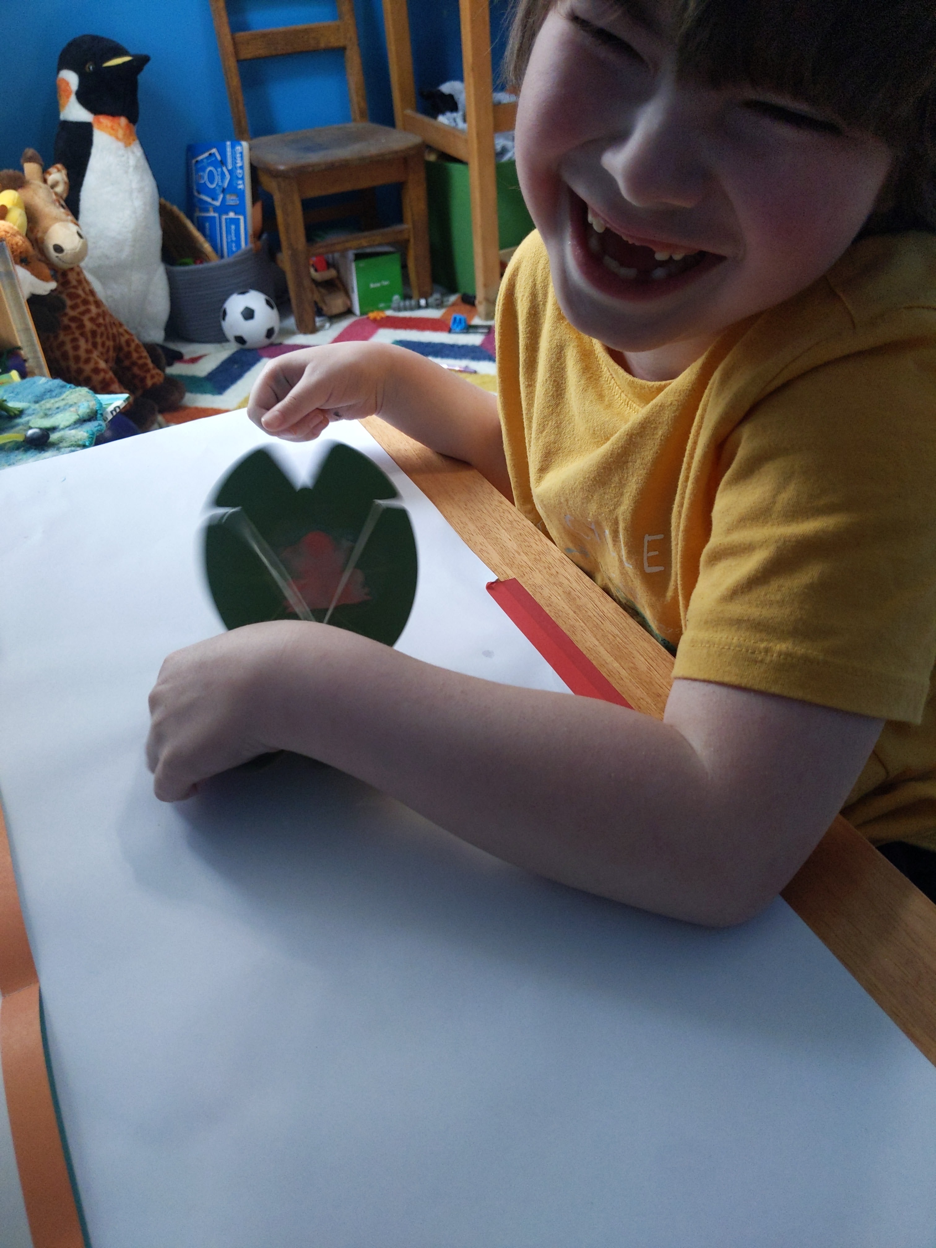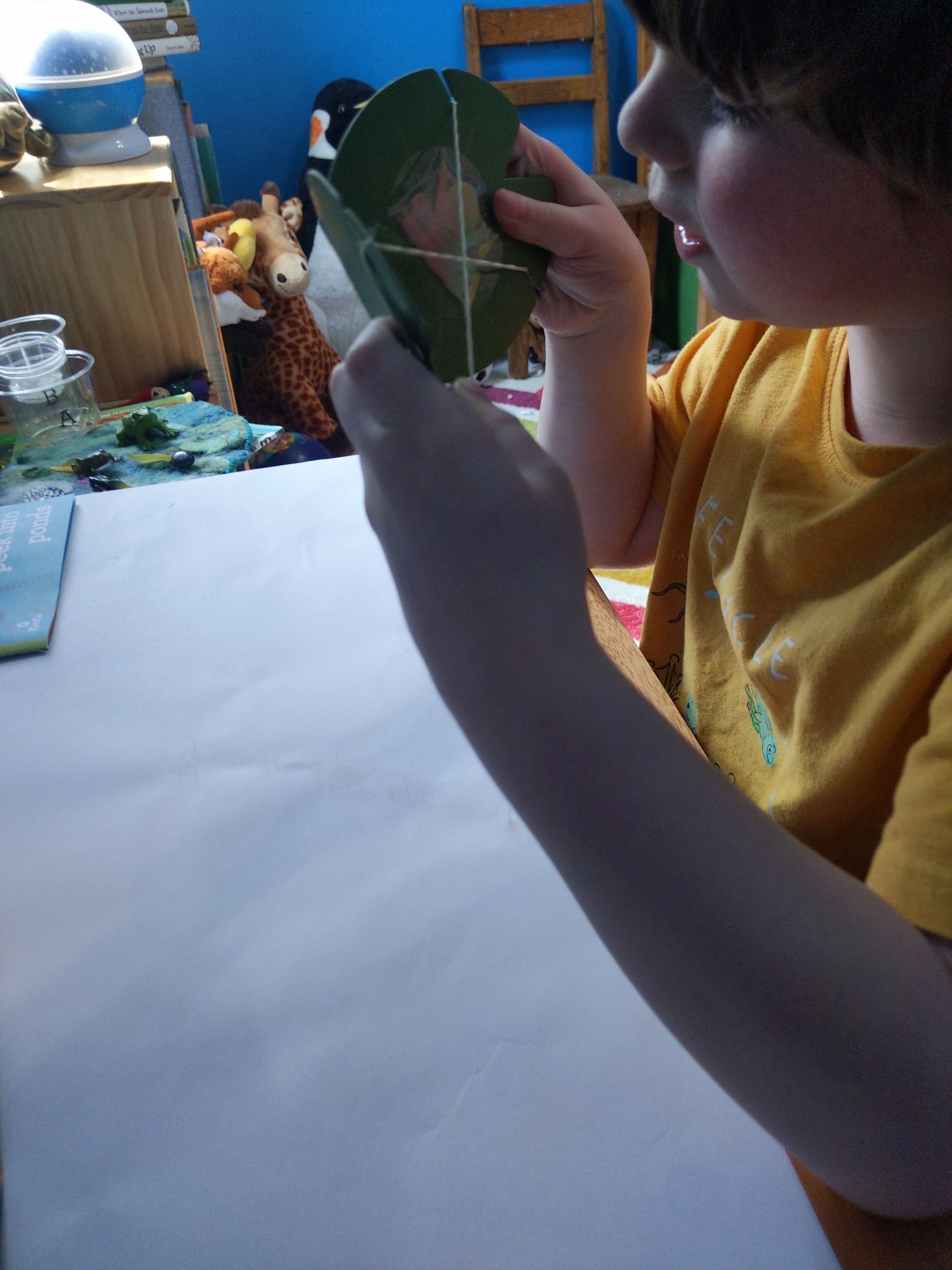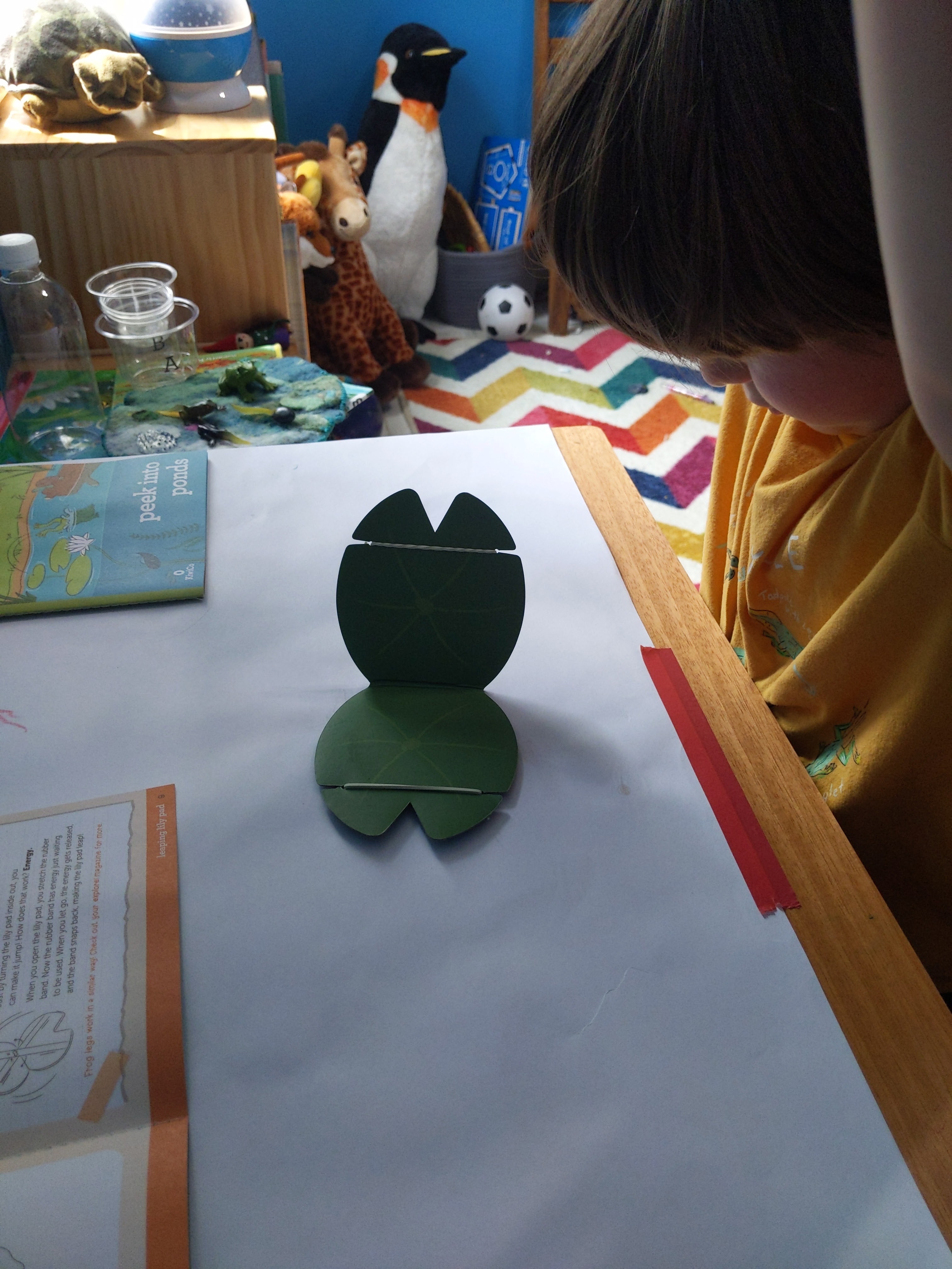 Next up was the leaping lily pad activity! This was Wyatt’s favorite. We took the frog from the previous activity and stuck it to the lily pad, wound a rubber band through the notches according to the directions, and then turned it inside out, with the frog on top. Then when you hold it down with your finger and let go, it jumps up into the air! This works through the release of energy. I could never manage to get a photo of it in the air, but rest assured, it hopped!