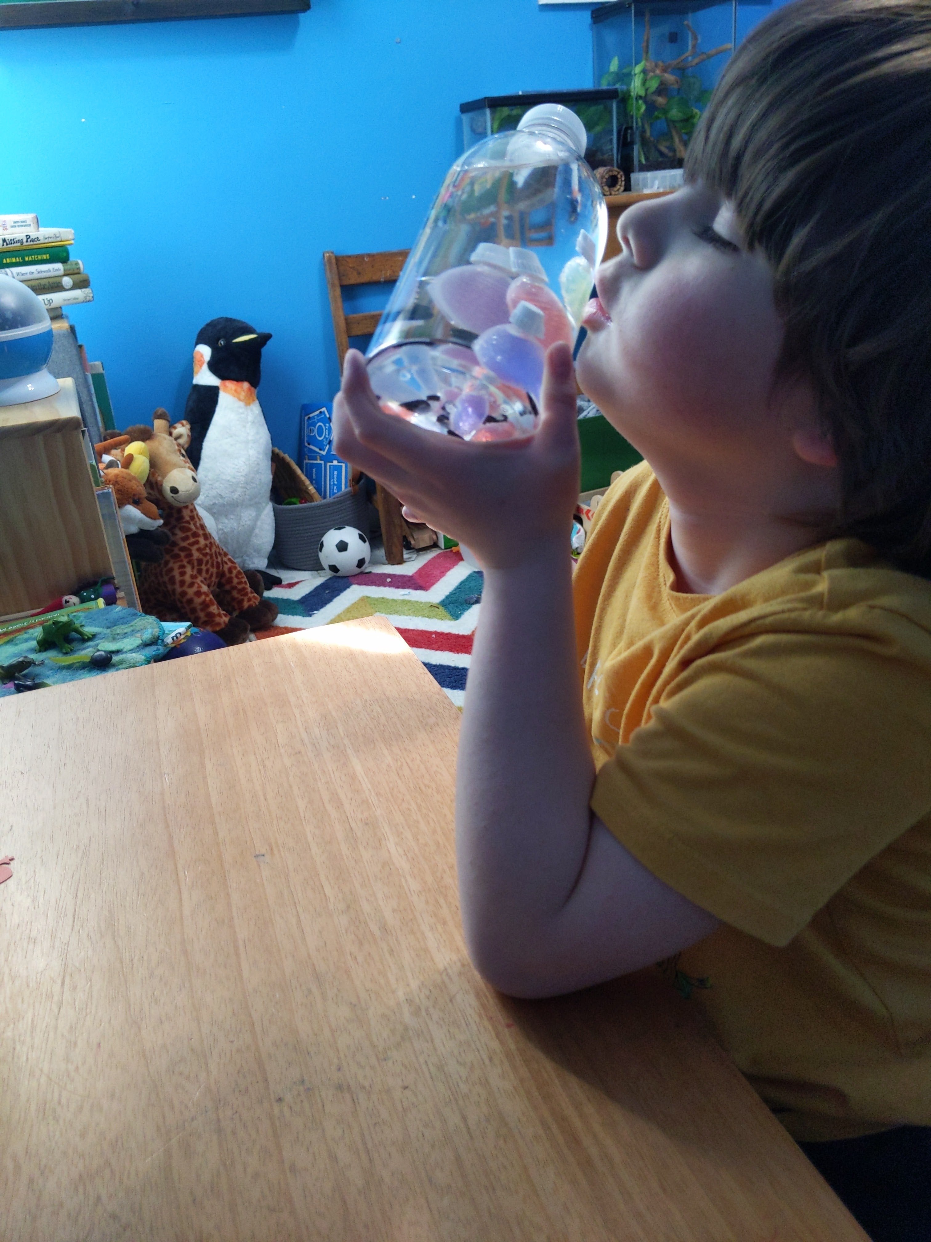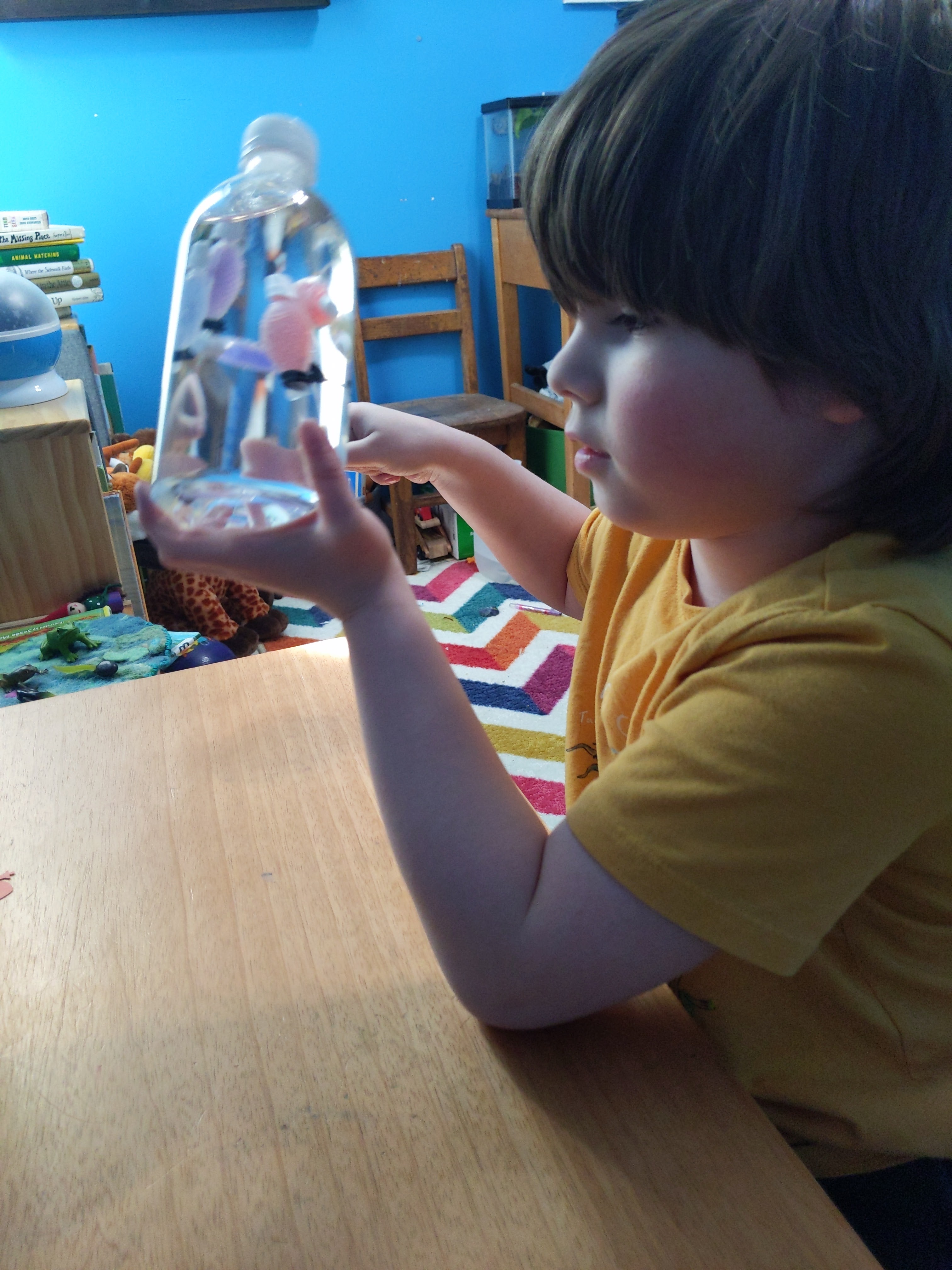 The final activity was an aquarium in a bottle. It had a lot of steps, so to sum up, we added colored salt water to plastic fish and then floated them in water. The trick to floating them up and down is to balance the amount of water and air correctly. Too much air or too much water will cause them to float on the surface or to sink to the bottom. We did have to make a few adjustments to make all our fish float up and down!
