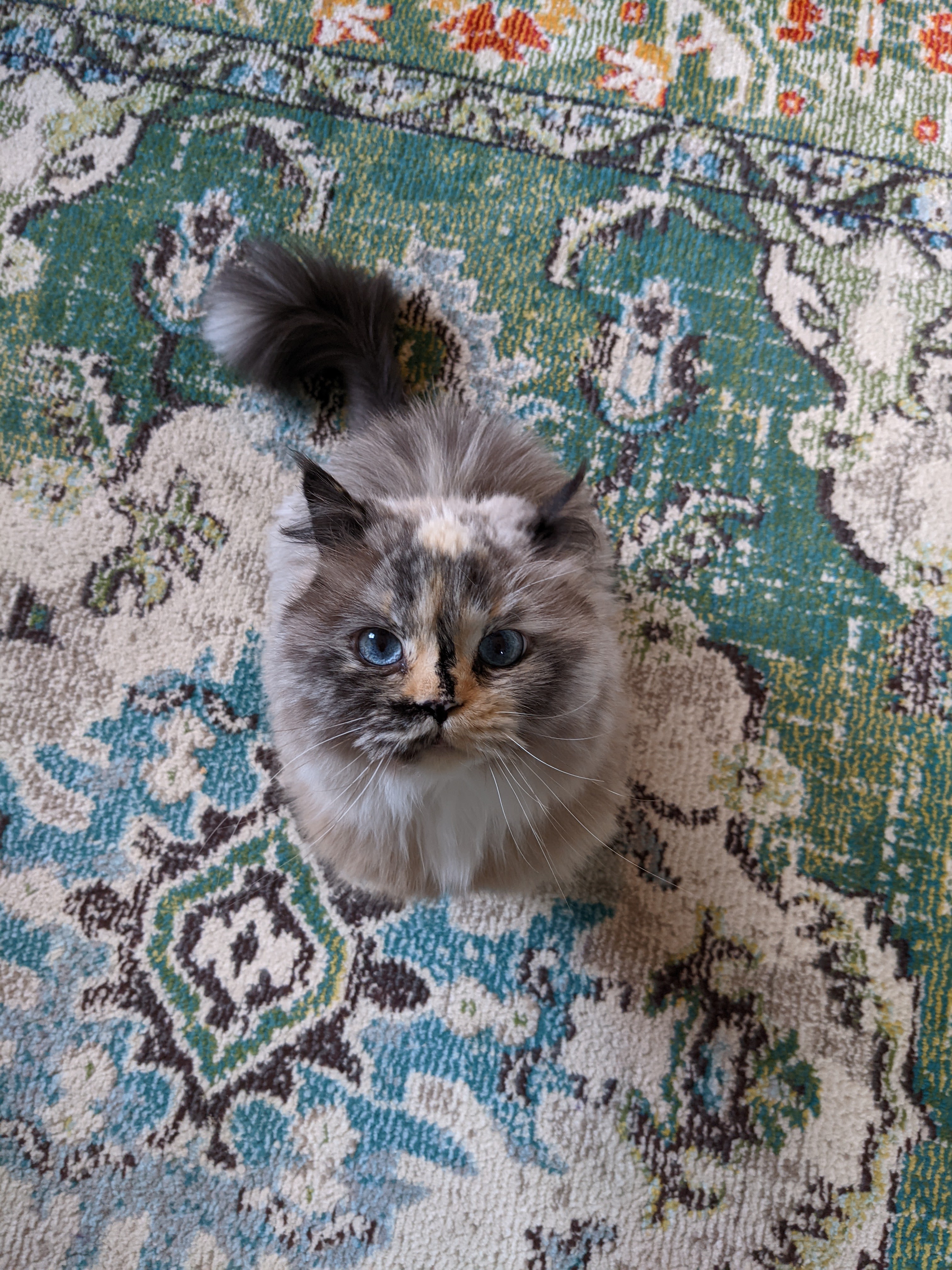 Thank you!! Miso is my little baby who came from a hoarder house. I was volunteering at the animal shelter when they all came in, maybe like 50 total living in 600 square feet. She is a tortie himalayan. Her face is sort of silvery gray,with the tan and brown as well. When we first got her she was young, like maybe 6 months old, and she only had the stripe going down her nose. The rest of the coloring has filled in over time. 🙂 She is our giant goofball too. 🙂