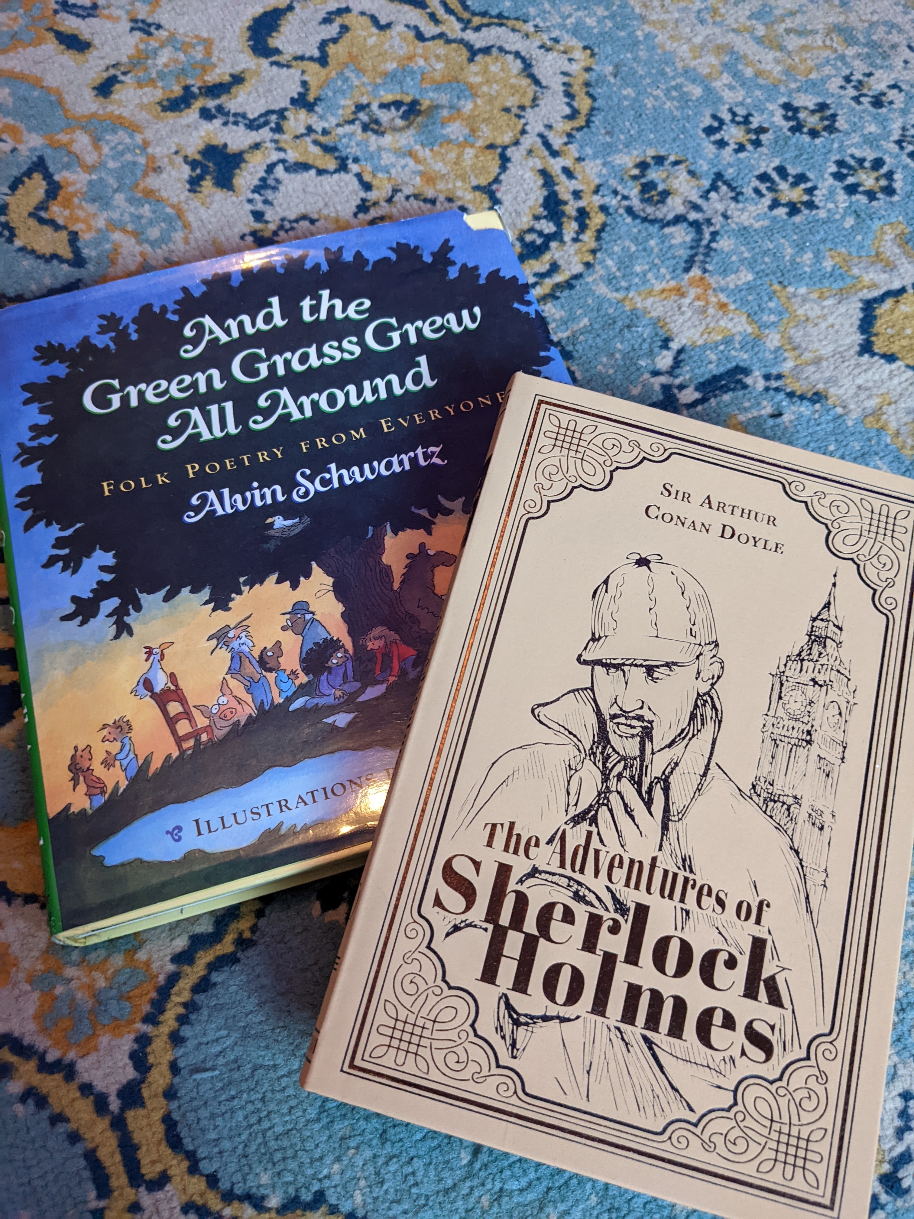 Brian is a whole foot taller than my five foot one so it was handy to have him there to get the books down from the high shelves for me. I ended up buying just two this time around – a Sherlock Holmes book, and a book of poetry for Wyatt.