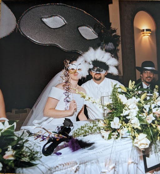 We had such a fun wedding, truly. We were 24 and young and just wanted a big old party. It was New Orleans themed, and instead of table numbers, we had New Orleans street names. We had cajun and creole food, and our favors were masks and doubloons and beads. We made all 400 masks by the way…. that was a thing. Billy’s mom made a gigantic mask to hang on the wall behind the head table – anyway, we had a party all right! People still talk about our wedding to us. We actually got discounts on things because vendors wanted to do it so they could add it to their portfolio, because I guess we were weird and different.
