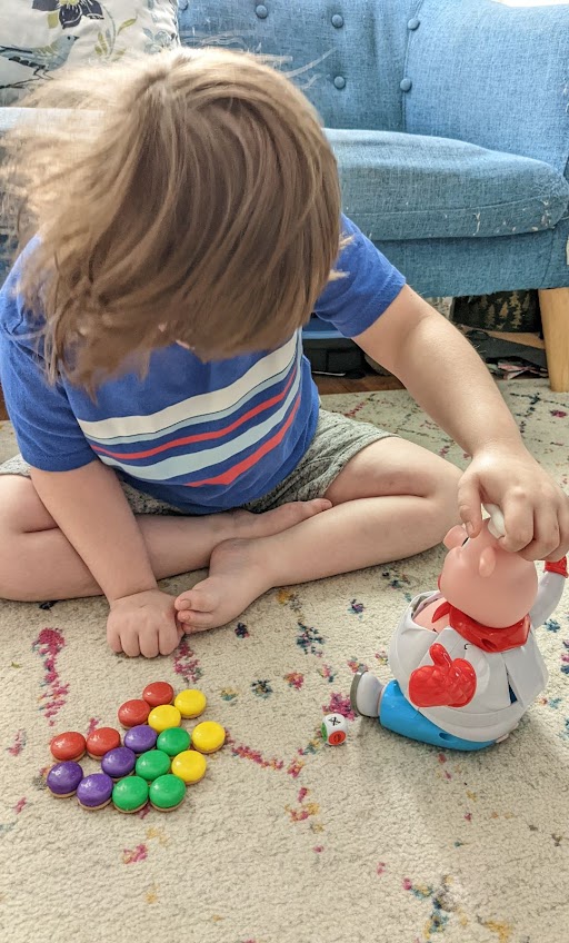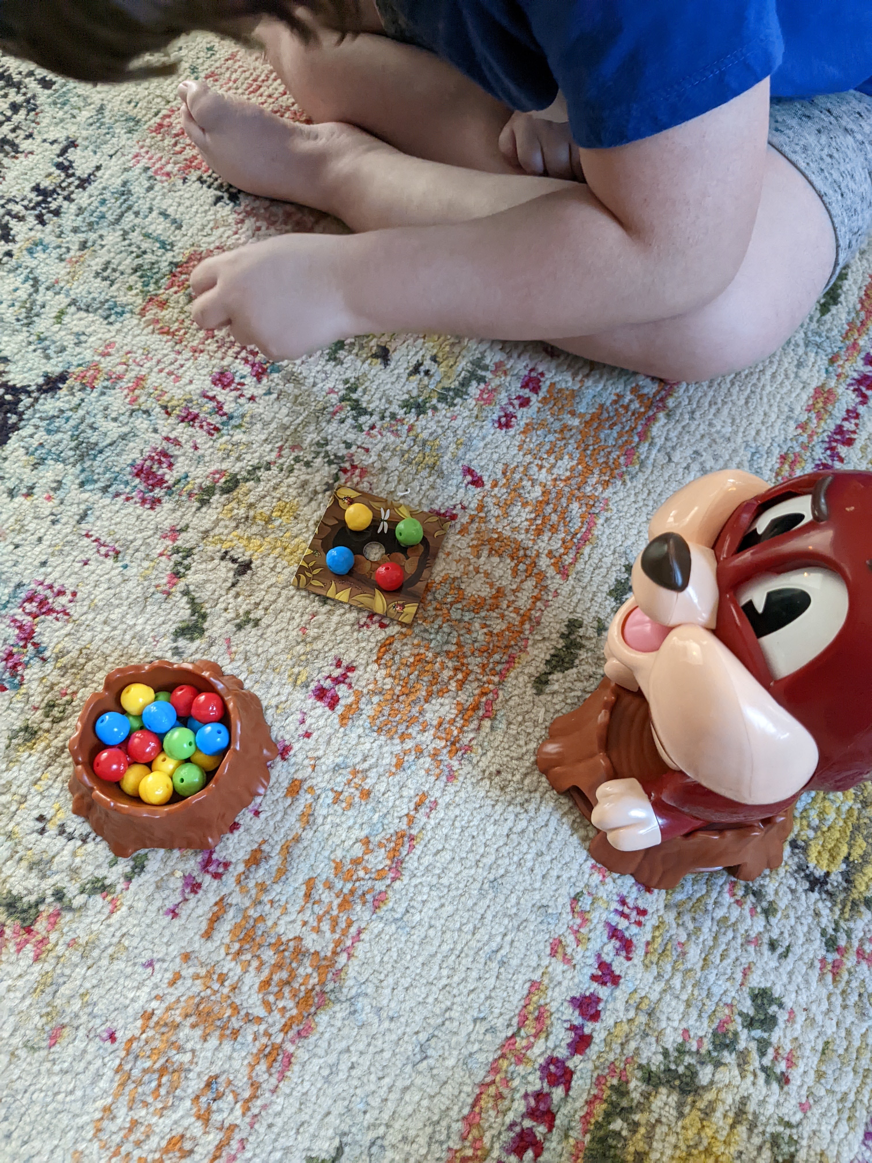 He loves Pop! the Pig so much, that last weekend Billy and I picked up a similar game, Chompin’ Charlie. This one is actually a little better at honing his fine motor skills, because the acorn game pieces are pretty small, and it’s a little difficult to stuff them in the squirrel’s face. He loves this game, but misses the more physical part of pushing down on the pig’s head from the other.