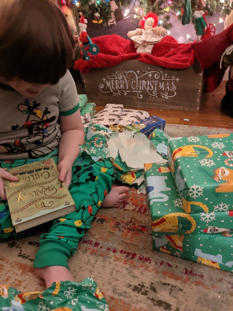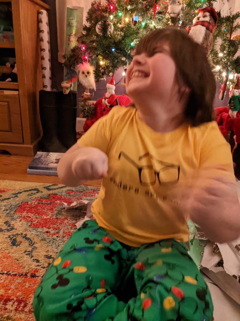 On Christmas, Wyatt definitely enjoyed himself, and he cracked me up with all his dancing in front of the Christmas tree both Christmas Eve and Christmas morning. He is joy. He loved his readers are cool shirt that we got him at the street fair this summer. We think the shirt is supposed to be a pun with “readers” meaning the glasses type readers, but we thought it was cute anyway and it was good we did since he put it on immediately.