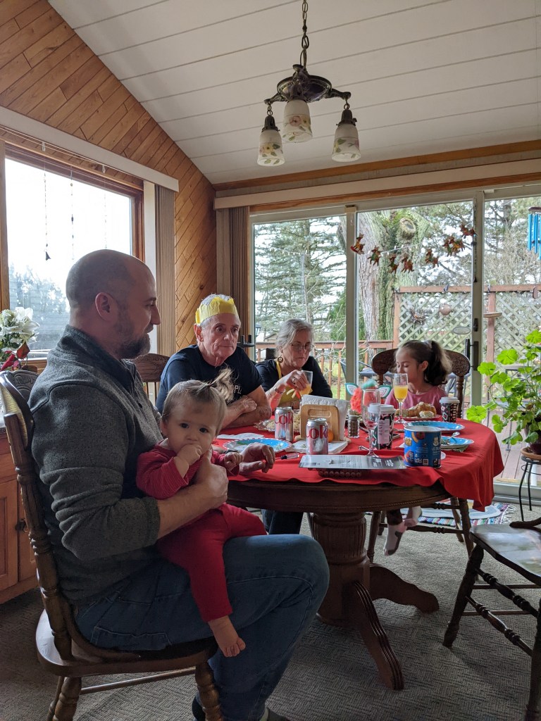 The next day (yesterday) we drove out to my dad’s house for our Christmas brunch with him. It was another laid back very good time, full of stories and food and laughter. The kids were so happy, and I think tiny bebe had a fantastic first Christmas! Can you believe that tiny little girl is standing and just about walking? Her older sister Mermaid Girl was walking at that age too!