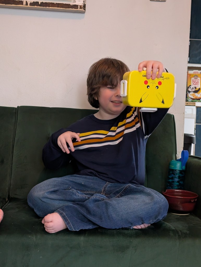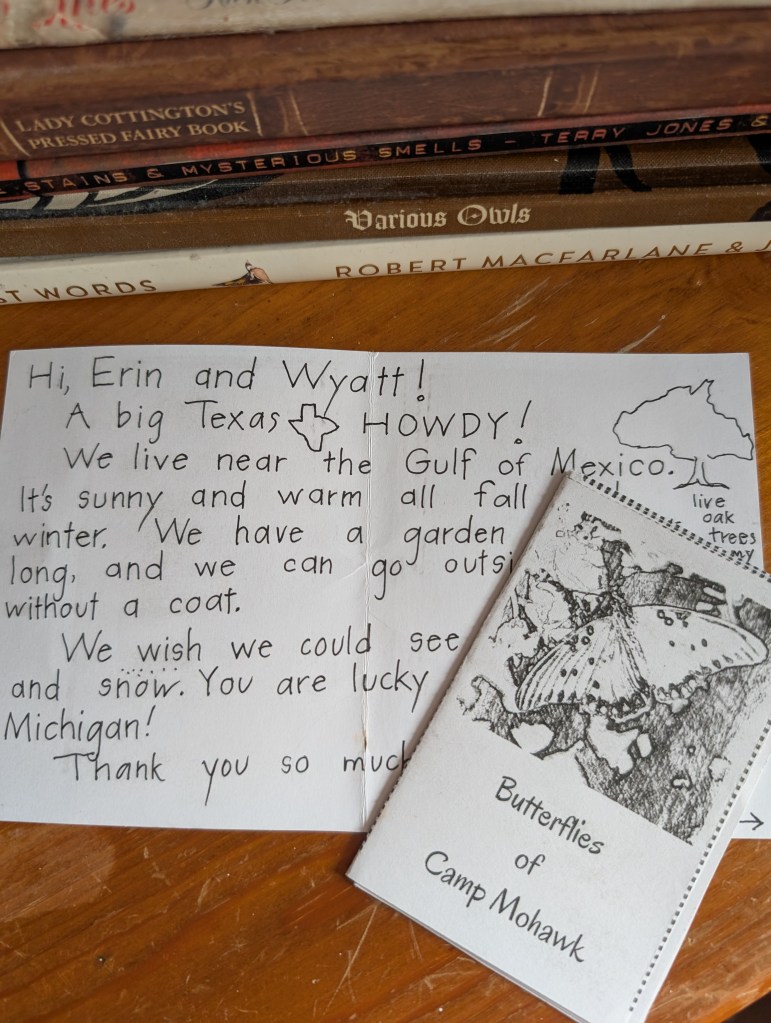 We had a fire with my brother and family, went to my dad’s, and my cousin and her daughter were there, as well as my stepsister and her boy (although he is 17 and like 6 foot 5). And we got fun happy snail mail from Deb at Readerbuzz! We were super excited to get her cheerful letter, telling Wyatt what life is like in her part of the world, and to look through the little zine she made as well!