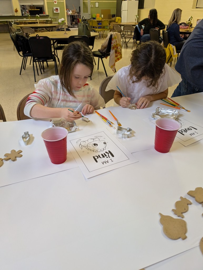 After going through the box, we started on the big activity, which was making ceramics with my mother-in-law. She had made a smattering of little ornaments, penguins and cats and little houses and flames but not traditional “Christmas” type ornaments, as we have some scouts who observe different religious holidays and we wanted to make sure we respected that. Then she also brought in some air dry clay as well, to show the before and after of ceramics. She started with that, having them touch and feel it and push cookie cutters into it to experience that part, then explained that they then go into a big oven called a kiln where they are fired. When they come out, they are hard like the finished ornaments. The kids had so much fun – even though my MIL brought the thing most dreaded by parents everywhere. Glitter. Glitter! Thankfully only two kids left absolutely covered in it. And who were they? The ones related to me. Wyatt and Mermaid Girl. I mean, if you know me and my brother, that tracks.