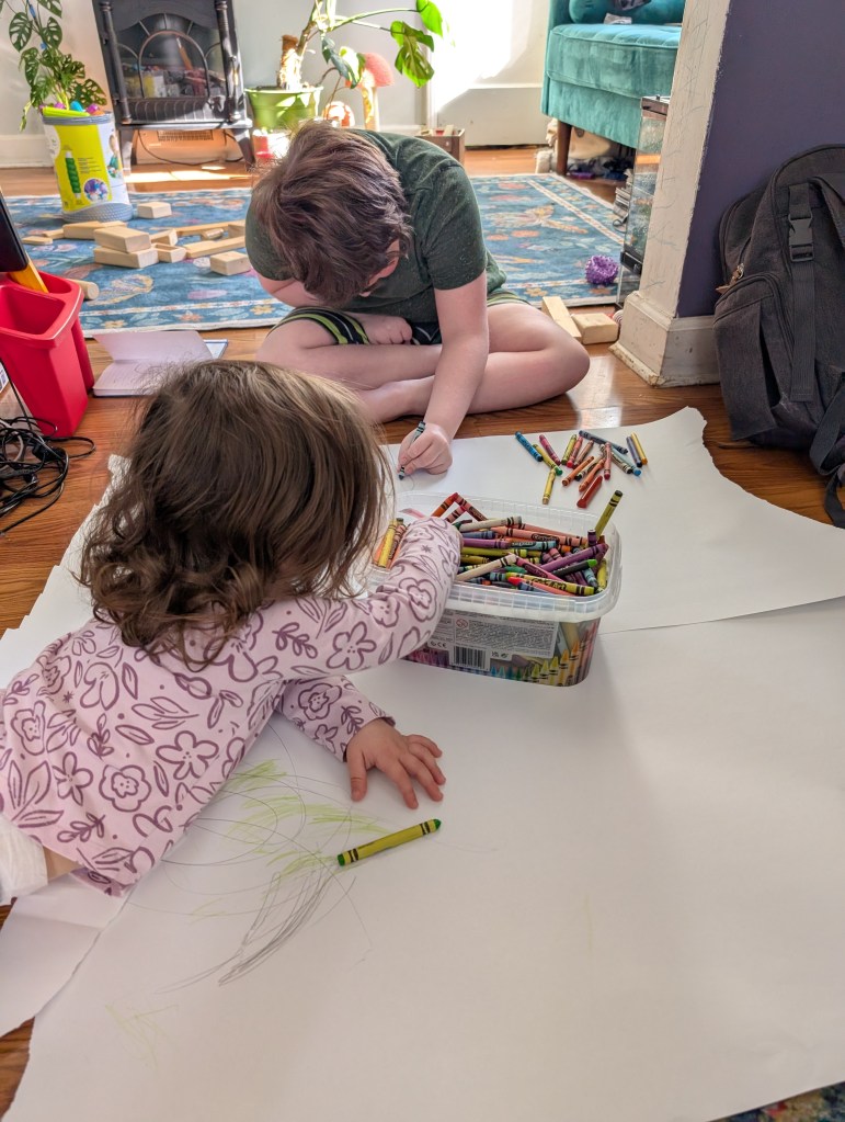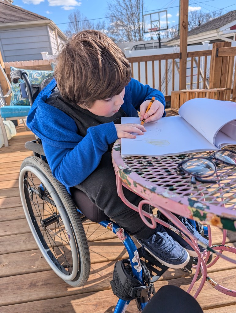 Speaking of his surgery, we are working on preparing for it the best we can. We have pivoted from walking as much in therapy to more strength training, both there and at home. We have added a few extra home exercises to build up his muscle strength, which will help him recover easier, and are just trying to get him to move any body part as much as possible between now and then. We scaled back on school for the moment, focusing just on the essentials (I mean, I think it is all essential but we are sticking a pin in a few things for now – like the Revolutionary War and artist studies).