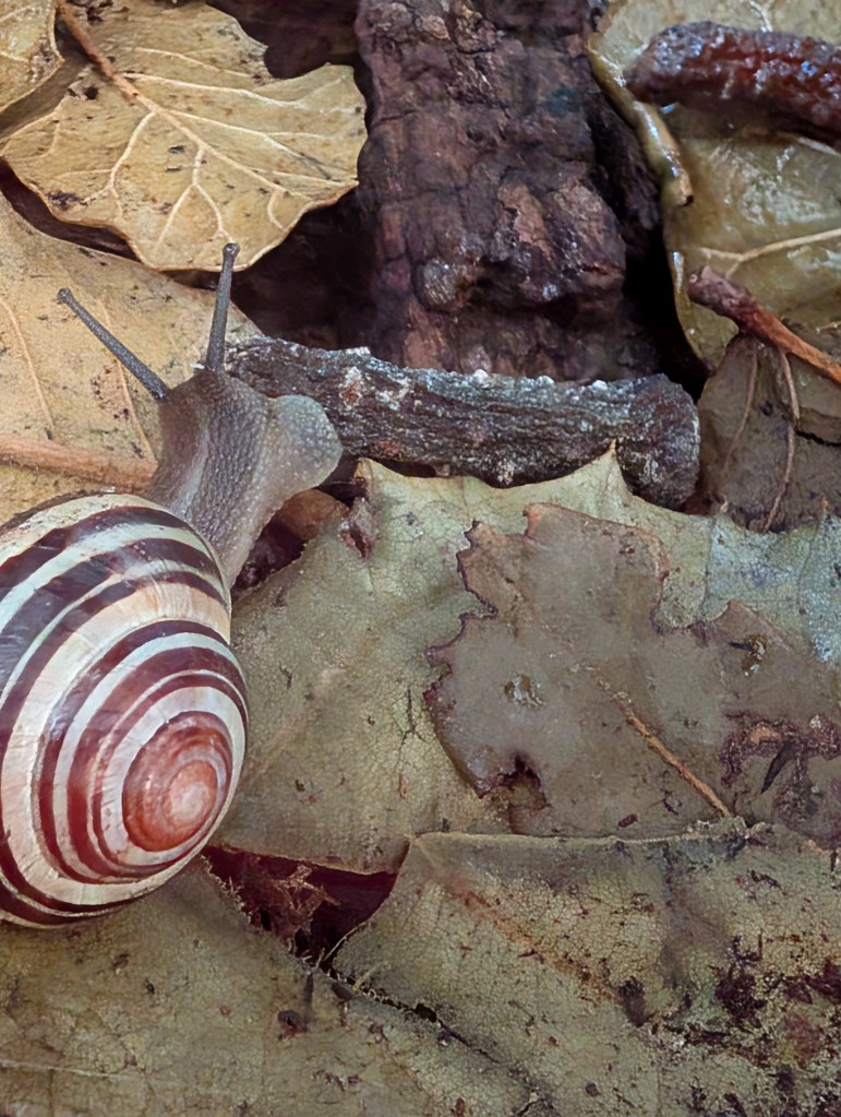 We are big snail fans here too. That guy is Stevie Wonder Snail, a garden snail we picked up last fall right before it got really cold in a sudden snap. He seems pretty happy!