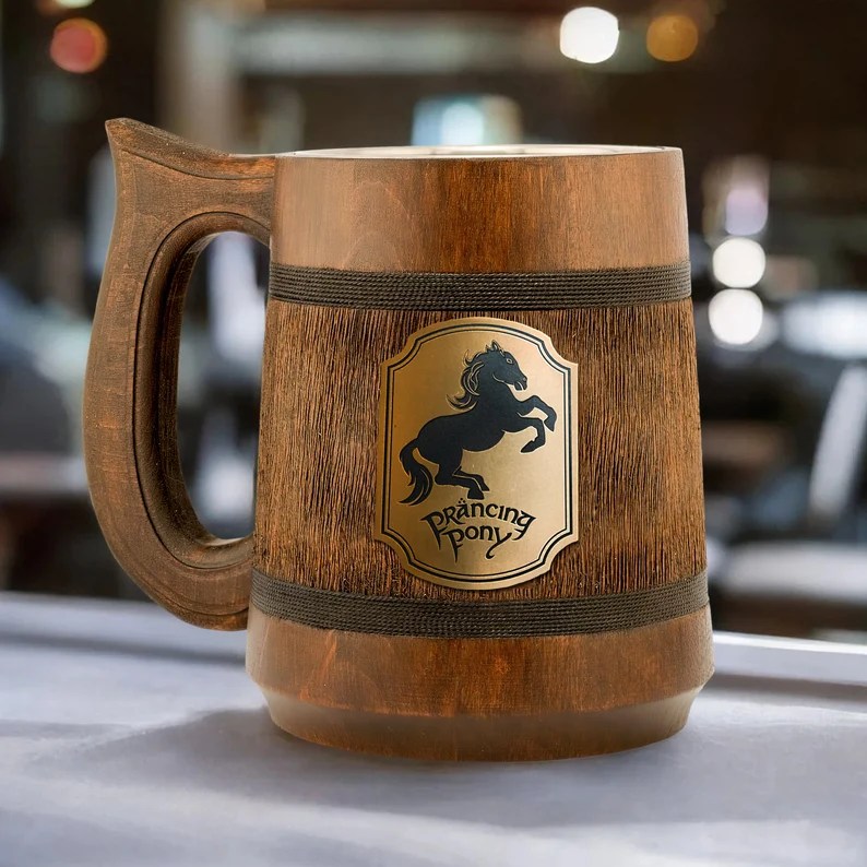 This Football dad tee, makes a statement without overstating it. Then a series of beverage containers – a Severance mug of Petey’s secret map, a Darth Vader whiskey glass, and my favorite, this wooden Prancing Pony tankard.