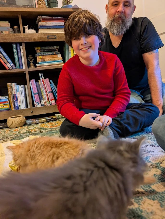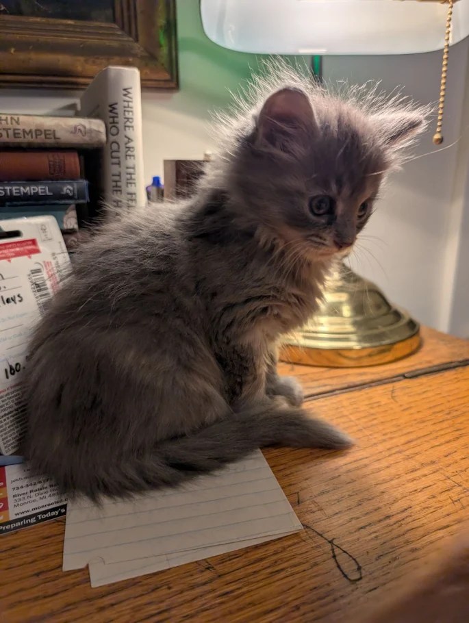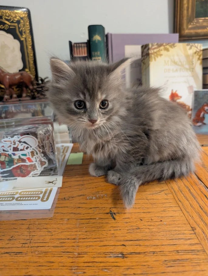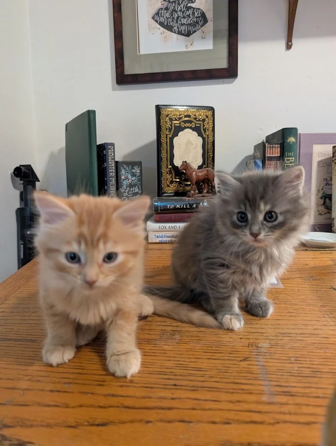I tried to go back to sleep but it was game over. The little plaintive mews came from the room, and Miso’s interest was piqued, and she was prairie dogging to look over the barrier, and then I heard a scrabbling and up popped a small little gray head. Mouse. In seconds she had scaled the wall and plopped down into the hallway. Miso just sort of looked at her like “What in the world is this?” as Mouse made her way into the bathroom. So I got out of bed, scooped up our adventurer, and put her back in the office. Then I got a coffee and joined them, while they played and climbed on me and decided my phone and coffee were new toys. Now I am chilling with Wyatt and Billy is hanging with the kittens for a bit too.