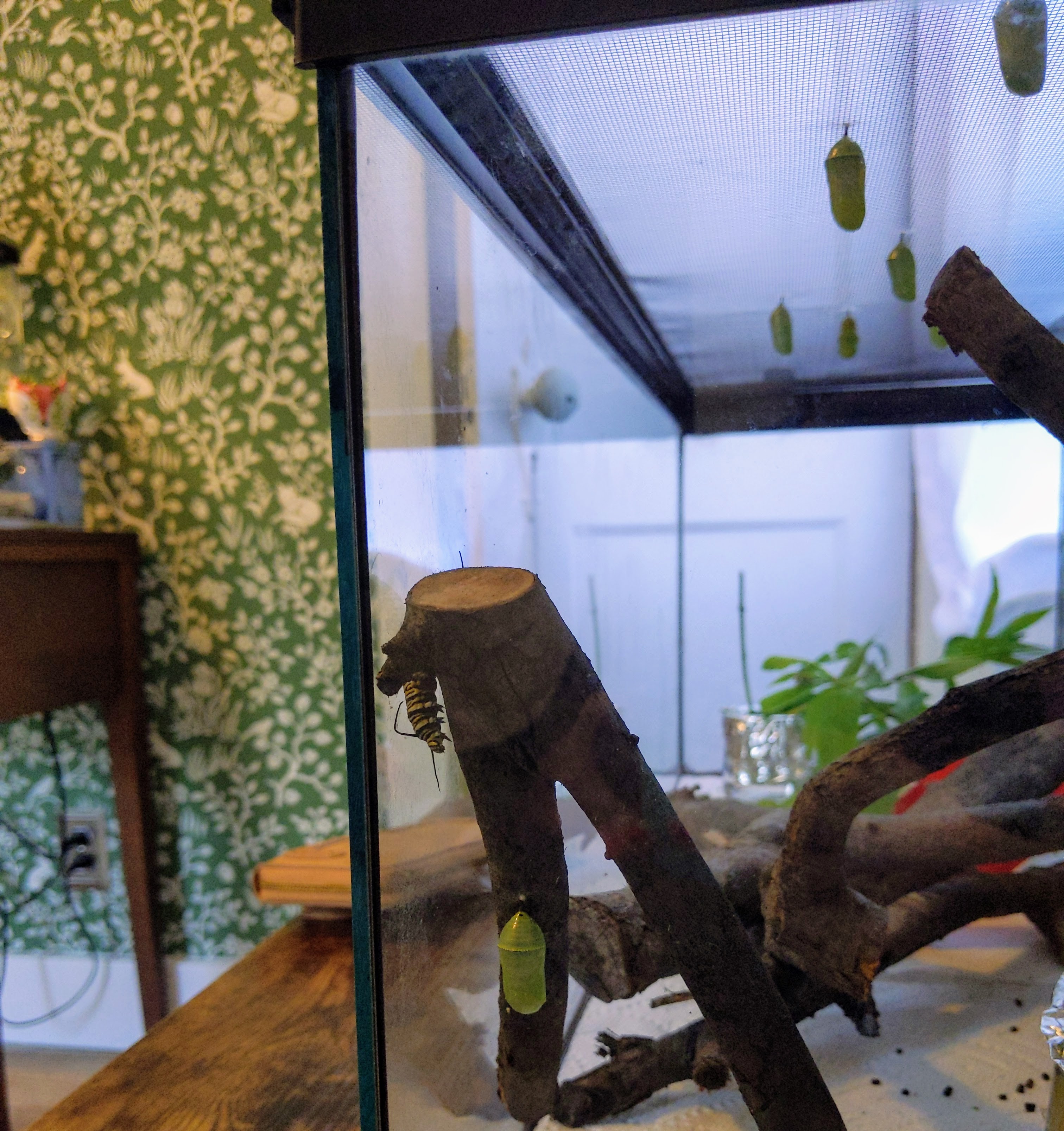 My office is one of my happy places these days. It is so full of life in here, my lizards, my butterflies, the plants. The scent of dill and fennel from the caterpillar tanks remind me of being in my garden, and combined with the green wallpaper, the desk, the carpet, it just feels so peaceful in here.
