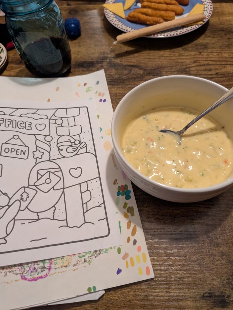 The soup for today is broccoli cheese, a favorite of mine during the winter. It is just so creamy and delicious!! Wyatt asked for a painting dinner, where we all do various art projects and eat, which Billy was skeptical about but it worked! I thought we would give it a try and if it didn’t work, we would just pause painting/drawing/coloring until we finished eating. It went fine! When I was kid we used to have reading dinners, where we would allowed to bring our books to dinner and read while we ate. Those were always a treat, so I thought it would be fun to let Wyatt have this easy wish. Especially since he didn’t feel super this week. He was all congested poor kid. He had a great time painting and eating his dinner. We all just scraped together whatever and did our own little pursuit.