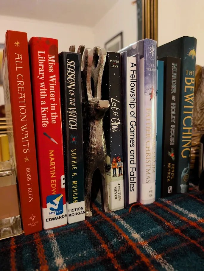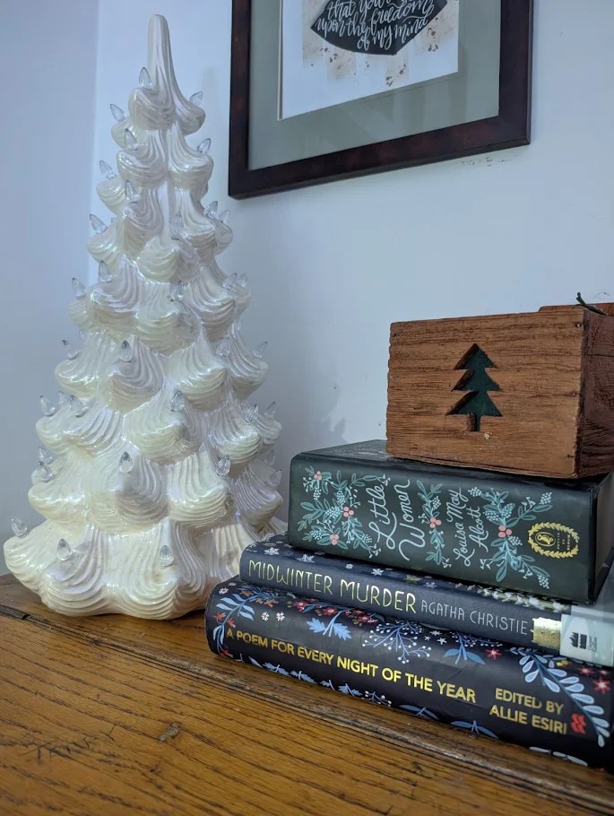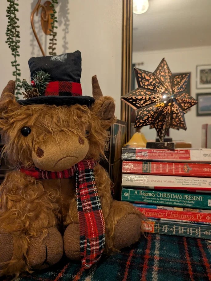 I decked my dresser all out this year as well, with Christmas books and a plaid wool runner, and my vintage Regency Christmas romance books. The stuffed Highland Cow was a gift from my son this year; I have named him Sir Reginald, as he looks like a down on his luck member of the gentry.