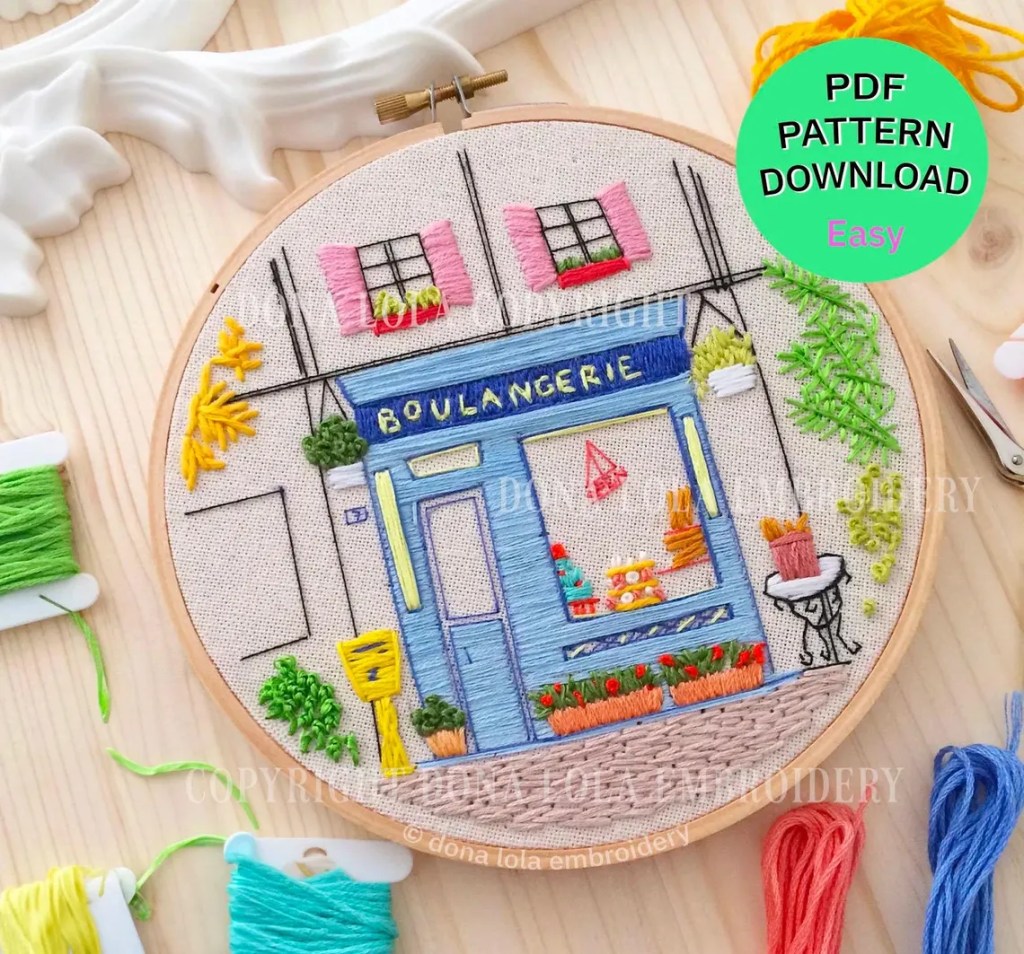 I embroidered this Boulangerie pattern and it is still one of the pieces I am most proud of. It was the first piece I sewed from a digital download pattern and it was easier than I thought. Plus the designer helped walk me through the process!