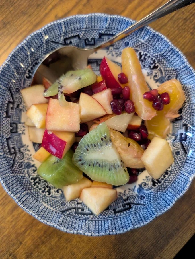 I am also enjoying winter fruit salad. It has apples, pears, kiwi, clementines or oranges, and pomegrante seeds and I could eat it all day. It just wakes me up!