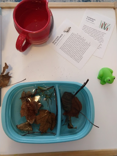 This week we learned about ponds, pond life, and frogs! I have to admit this week forced me to sort of overcome my squeamishness over getting my hands mucky – I am not a fan. Luckily Billy doesn’t mind so he could take over some of the messier aspects of our pond dipping experiences. That is the first thing we did – pond dipping! I had never heard it called this before but I like it. We bought Wyatt a catch and release beach aquarium, suited him up in his rain gear (he would not have liked sitting in muck either..), and let him explore the shallows of our favorite pond. Honestly, we didn’t find much! We did manage to spot an aquatic snail in our pail but otherwise, nothing. Lol. We did spot much larger creatures, from herons to water snakes to toads in the sand, so it wasn’t a complete bust.