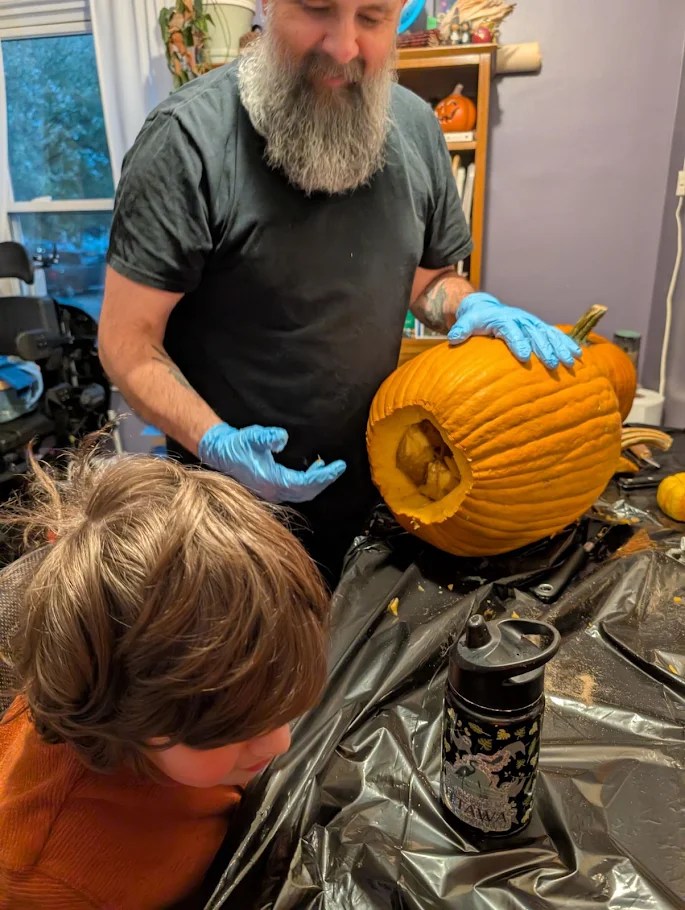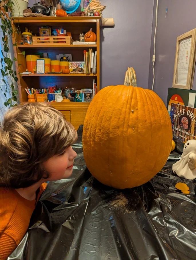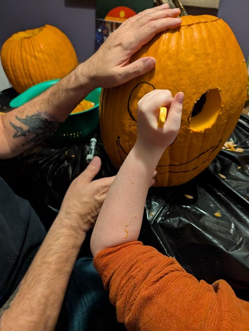 We carved pumpkins, which is always a tradition around here. Wyatt had a very visceral reaction to touching the pumpkin insides which could have been disastrous, but he held it together. He was very excited to carve them though, and was cracking me up giving his pumpkin kisses before he carved it. He is a super goofball. Last year for Christmas we had given Wyatt a set of Makedo tools (which he loves) and we learned that they are also useful for pumpkin carving! They are designed for cutting and creating things out of cardboard but it was good to know we can use it on different things!