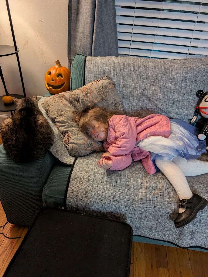 We went trick or treating a few hours and a nap later with his cousins, my brother’s children, Mermaid Girl and Little Bit. Mermaid Girl was Coraline, and she looked amazing as well. Little Bit was Elsa, but we had a little excitement and tears earlier when she fell face first onto the pavement and scraped her nose up horribly. Poor baby. She didn’t let it slow her down or diminish her joy of trick or treating though! Although she did have a really long much deserved cry beforehand. She loves Wyatt so much though that she was distracted from it when her parents told her that he was on his way over. She calls him Wy-ee and was waiting at the door and windows for him. It is so sweet and warms my heart!