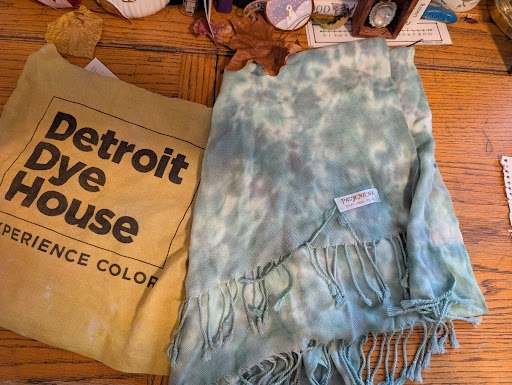 And, I also got my items from when I went to the tie dye place with my friends! I had made a pashmina scarf, a tote bag, and socks, which they donate to the unhoused. I really love how both my scarf and tote bag turned out! My scarf makes me think of malachite, and it is so pretty!