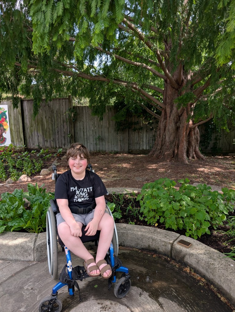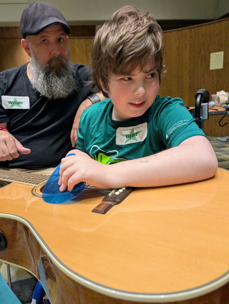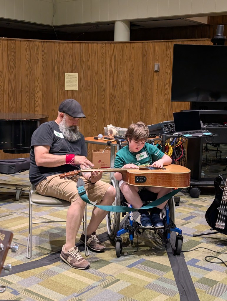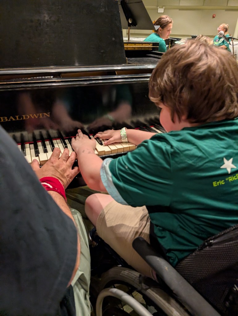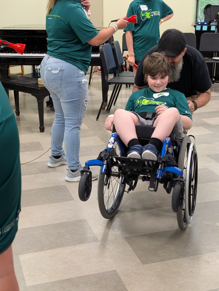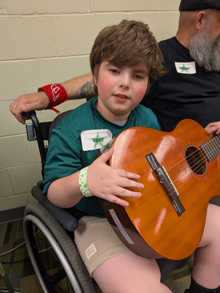 The sessions are an assortment that include composition corner, which Wyatt liked, tech tunes, rhythm, musical stories, guitar jam, the dance and music expression class, and beats blues and booms. Wyatt really enjoyed them all this year, but his favorite this year was definitely guitar jam. This sort of blew our minds, as the first two years, this class for some unknown reason, made Wyatt cry. I have no idea why. However, this year, he was totally in. He loved playing the guitar, he loved the therapist Vic who ran it, he was participating and laughing and having fun. I was beyond happy about this, and I know Billy was too. But the thing that really got us was that Wyatt wanted to, on his own volition, to say goodbye to Vic. He wheeled over to fist bump him goodbye, and if you know Wyatt, you are probably just as shocked as we were. Wyatt does not do goodbyes. They usually upset him and he is very avoidant. So to see him seek this interaction out was amazing. Of course, a few minutes later when he was saying goodbye for the year to everyone else he had a meltdown, but it didn’t matter. We had that win. That one huge moment. Special needs families always say that we don’t have milestones, we have inchstones, and this was definitely one for us. It was huge.