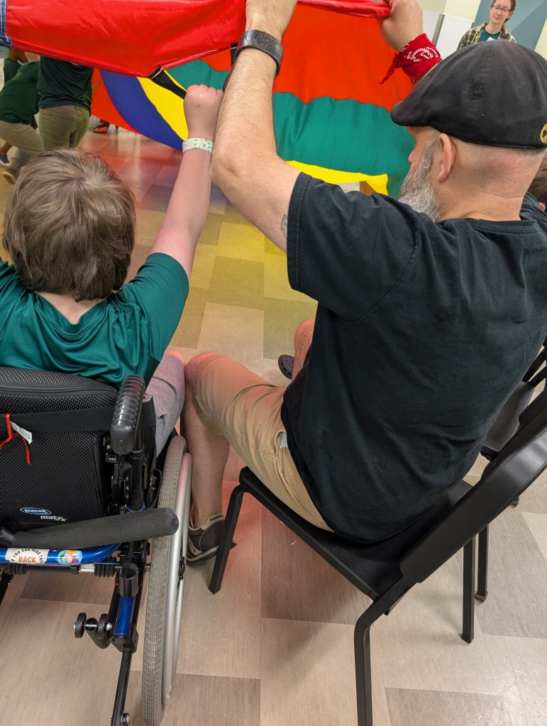We started off with more dancing in the cafeteria. Today Wyatt took a minute or two to warm up to being back before joining in, and it helped that they were playing with the parachute. He loves that. I think all kids do honestly. I sort of want a small one for scouts to do the same activities. The therapist plays music, the kids all raise it up and lower it, go under it, catch and toss balls as a team. The whole thing is pretty fun and Wyatt loves it. It must be evident, because Wyatt’s group leader told us that his face was pure joy during it.