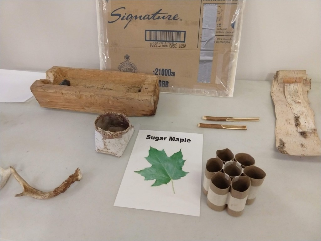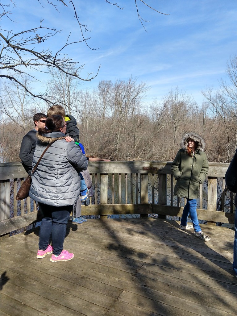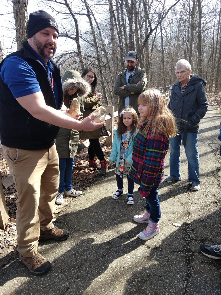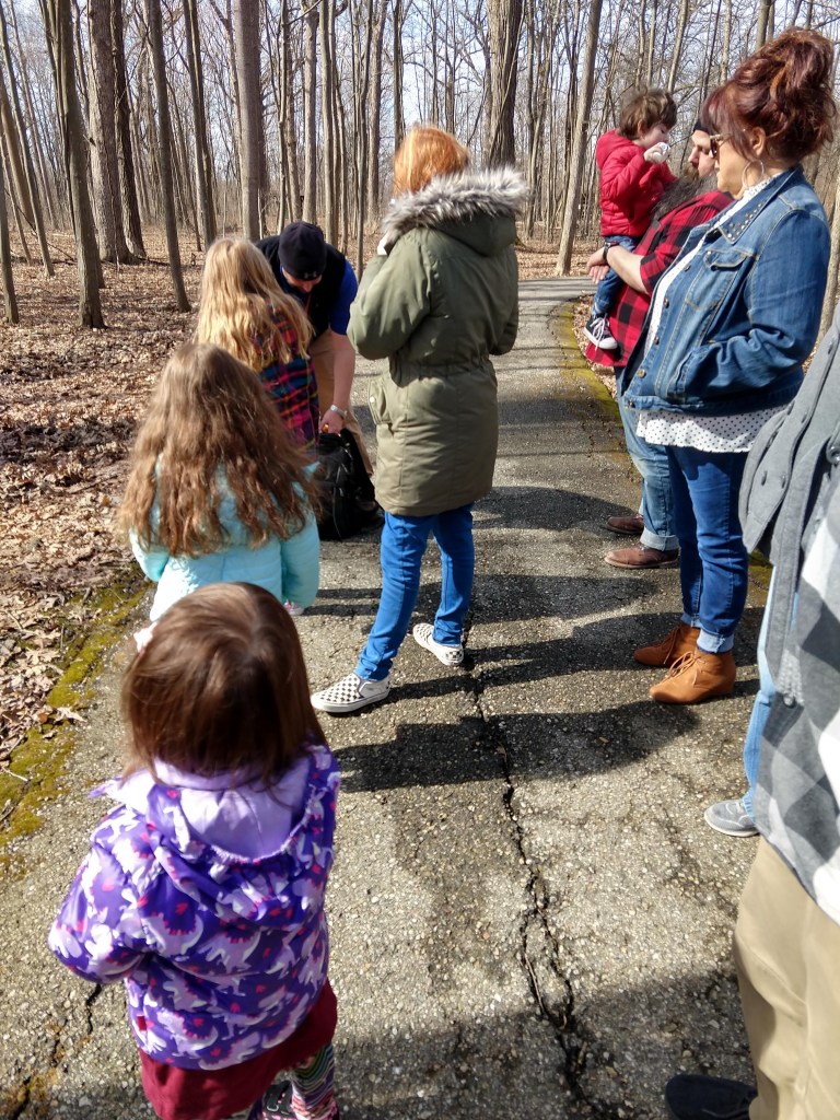 However, the weather was beautiful and sunny and 60 degrees! Last year on Wyatt’s birthday, we all drove around in a blizzard. This year, a gorgeous spring day. Not that we were complaining! But we did change the plan – Kevin the interpreter suggested a nature hike with the kids instead, and we quickly agreed! The sap wasn’t running for him despite great effort, so it made sense for us to take advantage of the weather. And the kids and adults both had a great time!! We learned about skunks, birds, beavers, trees, maple syrup, and even spotted a fairy door in the tree.
