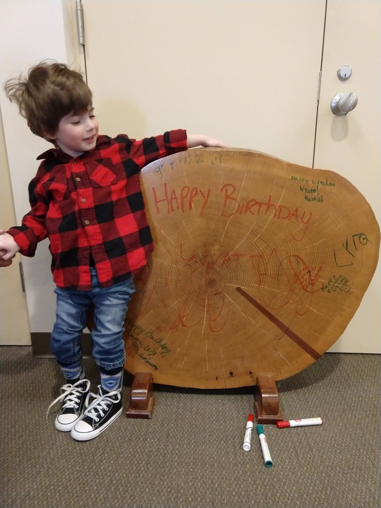 The metropark did such a great job, seriously. Before we even got there, they had the tables arranged, coloring sheets that were lumberjack and maple syrup themed, and little trees set to mimic the woods outside. They even had a stump (that I think was lacquered in the 70s) set up with dry erase markers to wish Wyatt happy birthday on!