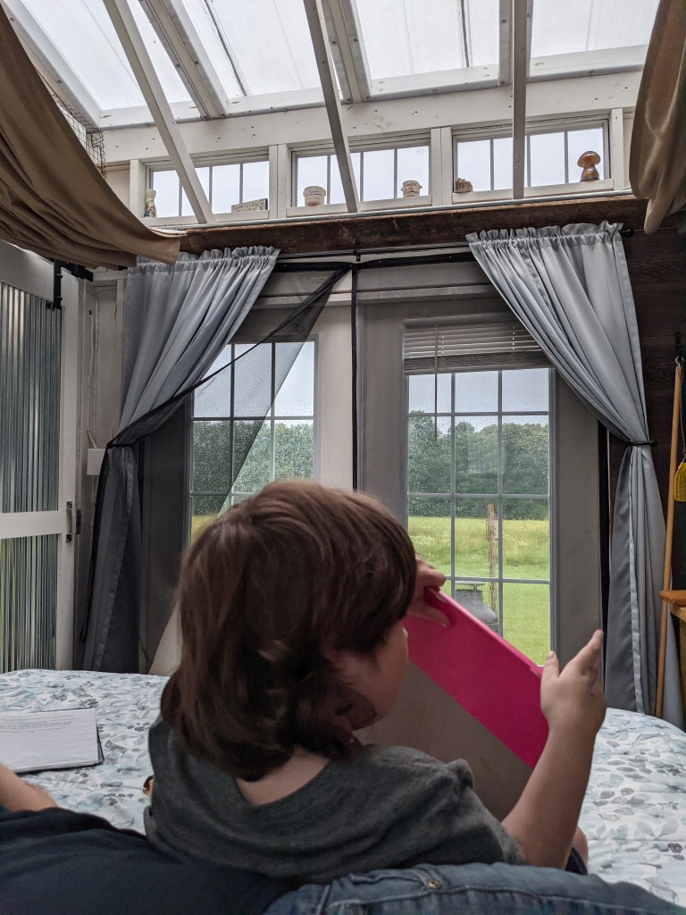 We pulled in and the rain was just coming down like crazy! We raced up the garden path and up the few stairs and burst in to the shelter. And instantly fell in love with our little home for the weekend! I threw open the curtains, including those for the skylight, and we lay on the bed just listening and watching the rain come down. This for some reason had a huge impact on kiddo. He talked about it all weekend, the rain on the skylight. It is always surprising to me what kids hold on to. After an hour, the rain stopped and we had a furry visitor at the door!